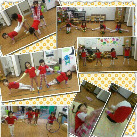 ところどころ忘れていると、子どもから指摘されてしまいました…若さには勝てませんね!!その後はフラフープとマット運動