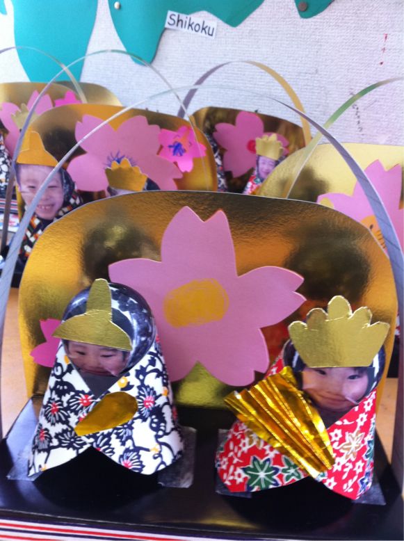 We are going to celebrate HINAMATSURI or Doll festival in Japan tomorrow。In Cherry class kids made craft related to Hinamatsuri. We made triangle – shapes kimonos and kids pasted their own pictures to one of them and drew face to another. Most of boys drew their mom’s face to hinasama. They were so sweet..
