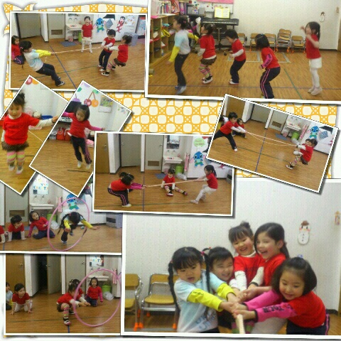 UKIUKid's Mondayは、フラフープ潜り、大縄と綱引きを行いました。みんな腕力が弱いので、強化していこうね