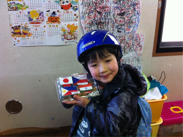 We put the flags on the top of the plastic box to distinguish which country the food came from.