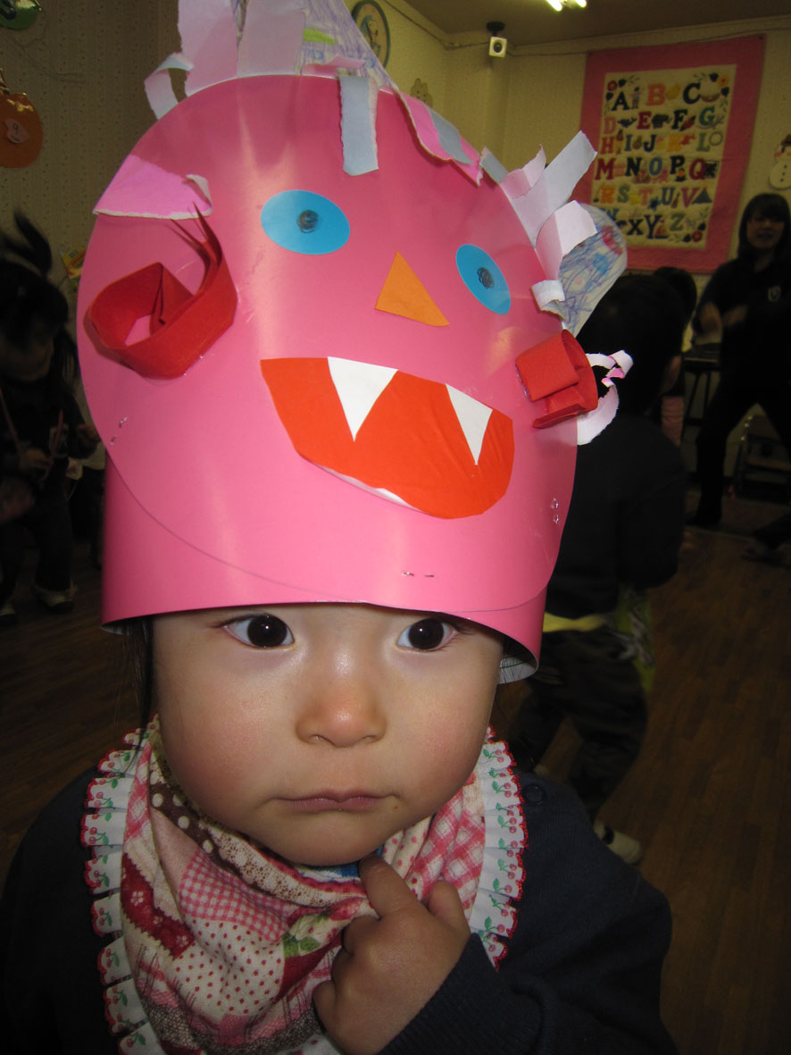 さて、今日の豆まきは、Cherry・AppleさんにはGrapeクラスの優しい鬼が、Grape・Melon クラスには、こわーい鬼がきました