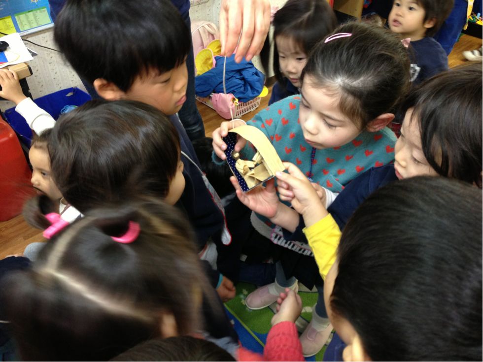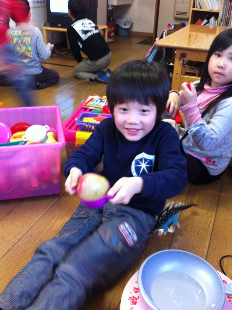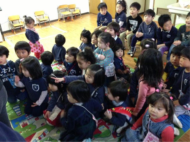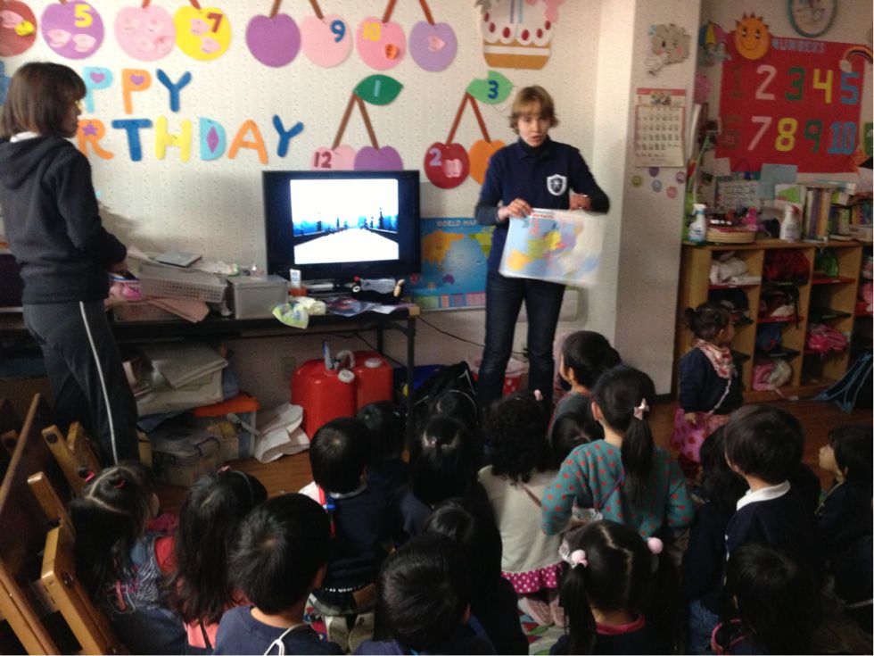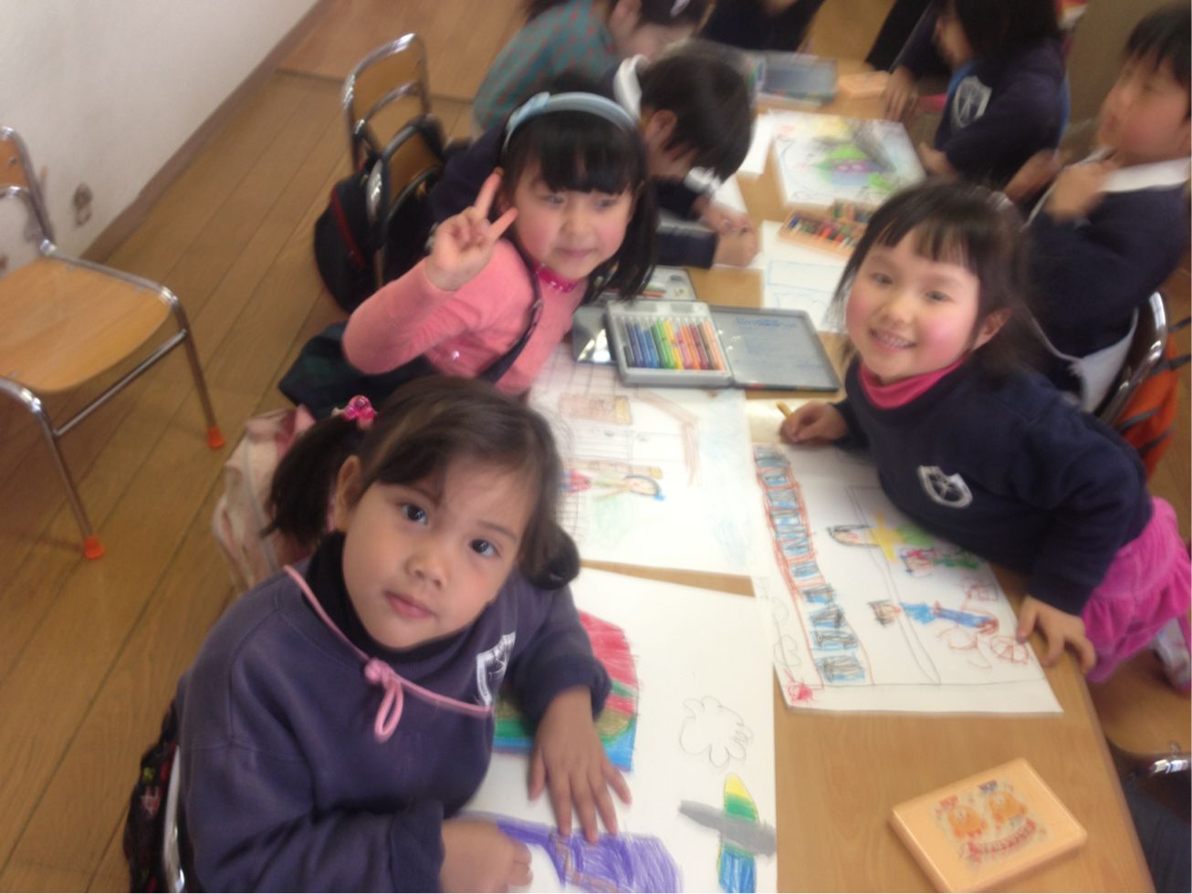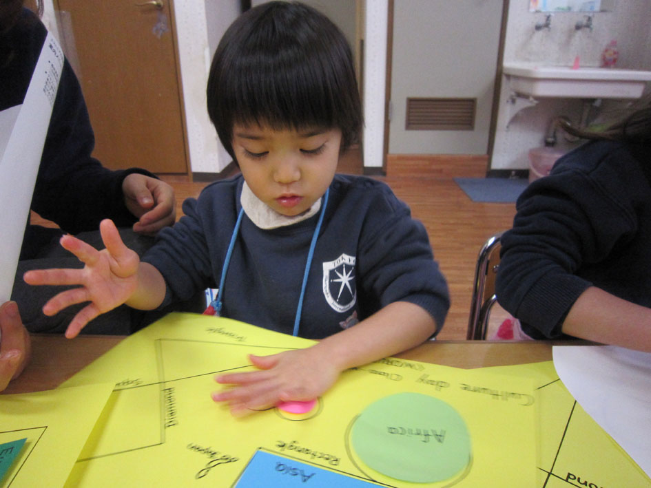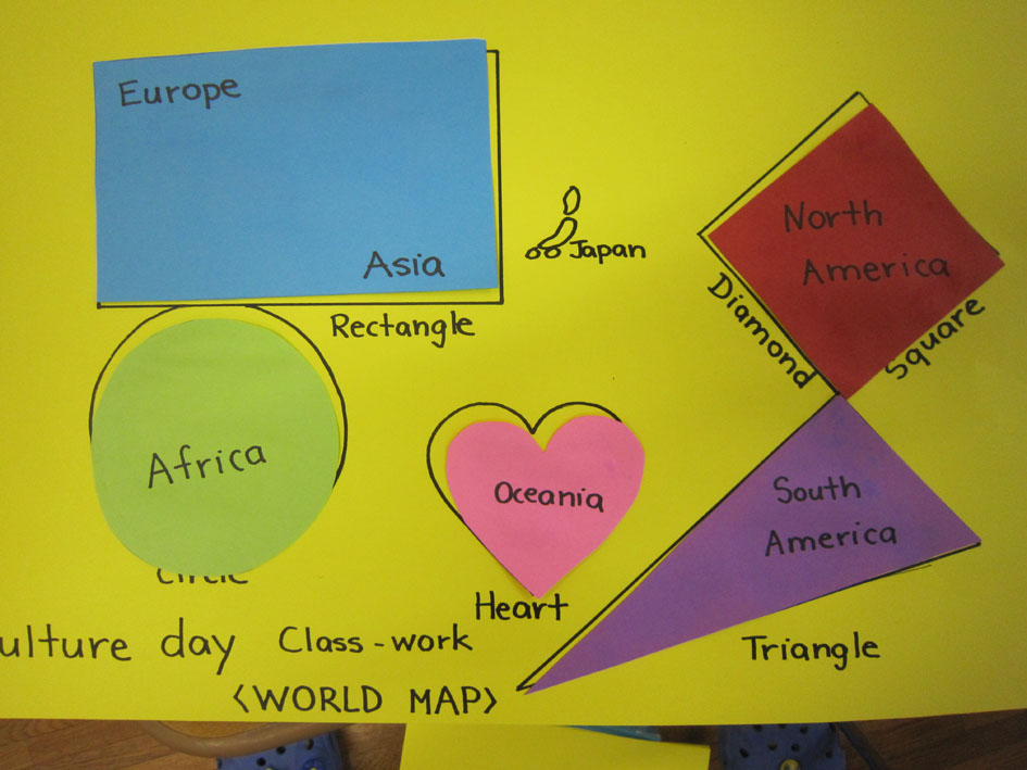 In the event of Culture Day, we talked about which country each kids in Apple Class are from as well as the teachers who also are from another place than Japan. And as we study the different countries and their flags in the map on which these friends and teachers are from,we made our own World Map.