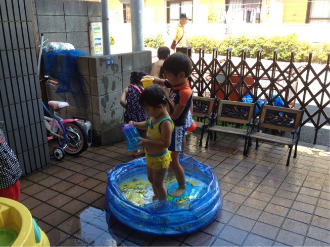 After our discussion and a little song and story time,we let the children play outside with water since it is still a little hot out to go to the park...and the kids enjoyed playing with water...