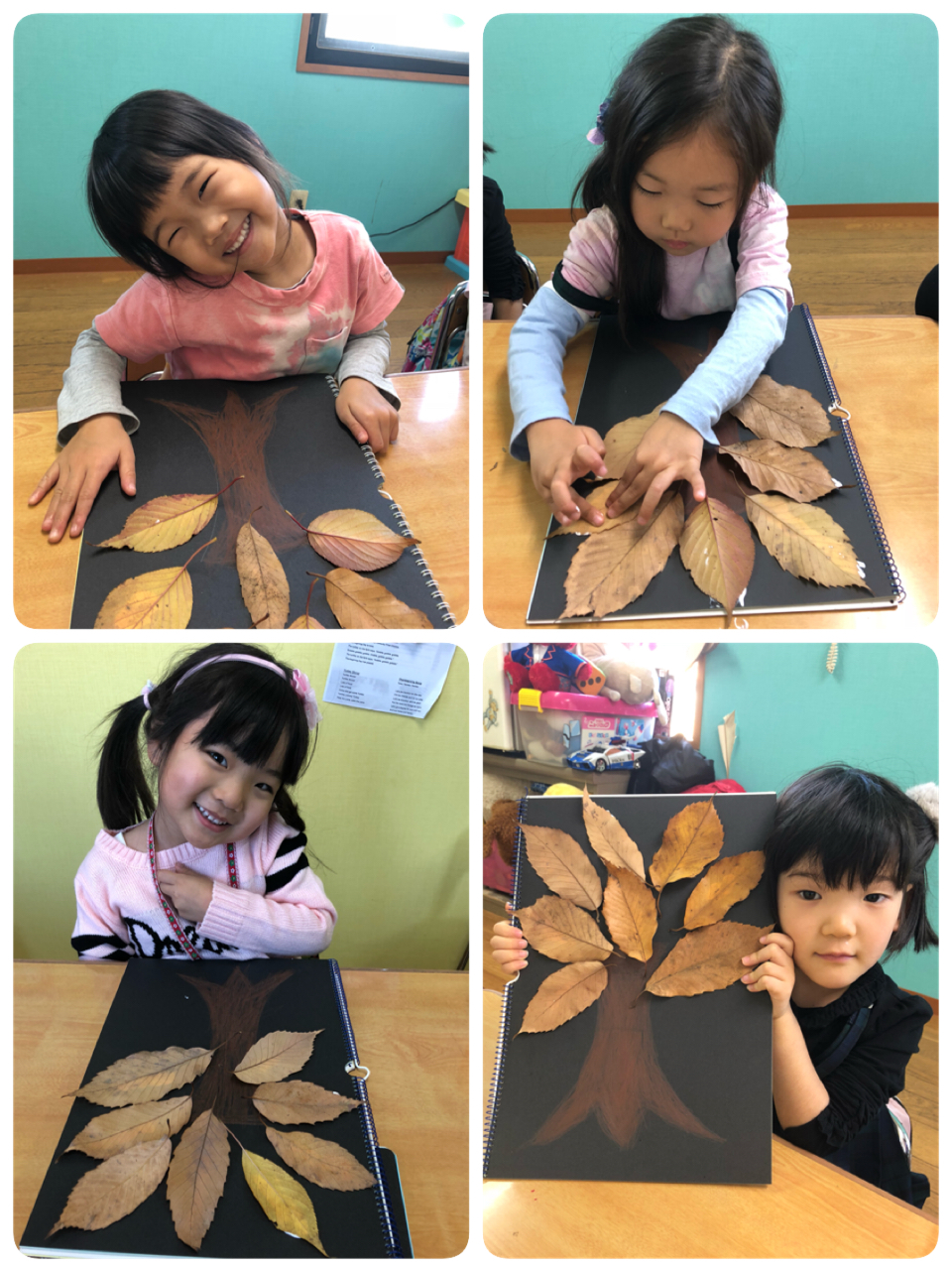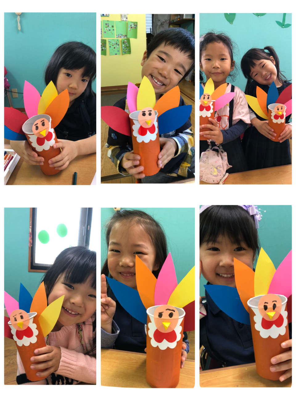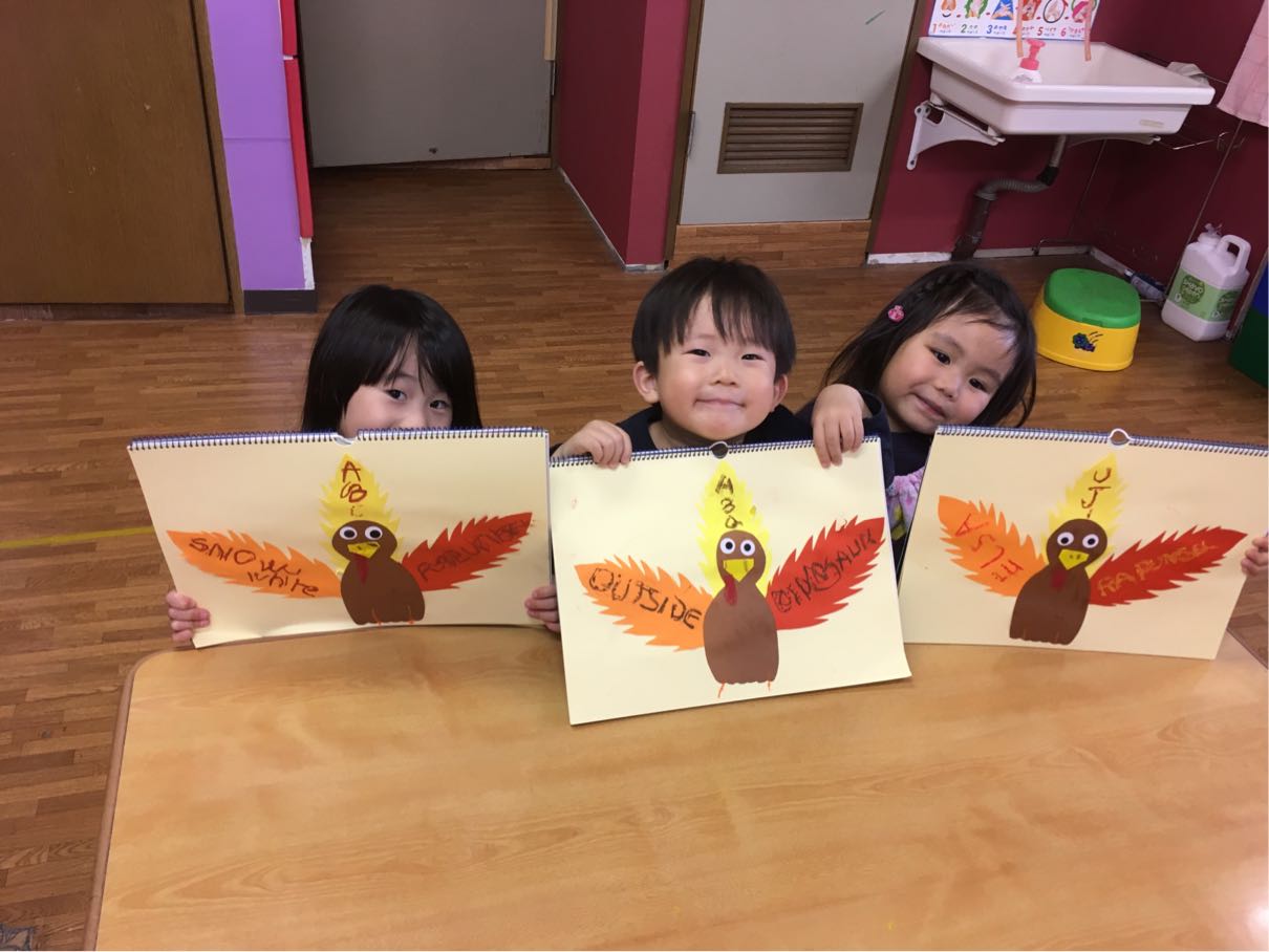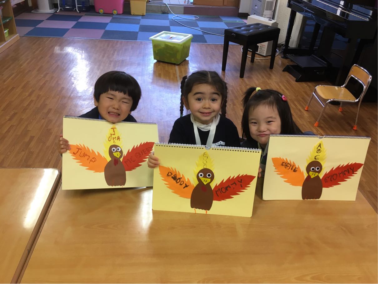 サンクスギビングのクラフトをしました。のりの扱い方が上手になり、スムーズに出来た〜〜とMr. Charlsは大喜びでした!