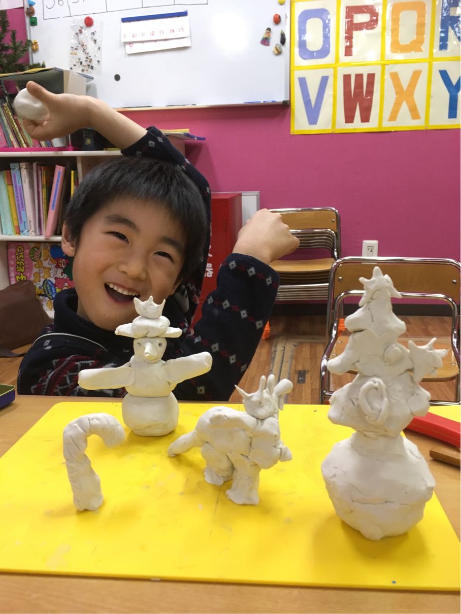 クリスマスに関する作品、というテーマでR君は粘土でクリスマスツリー、キャンディケーン、トナカイと雪だるまを作りました。