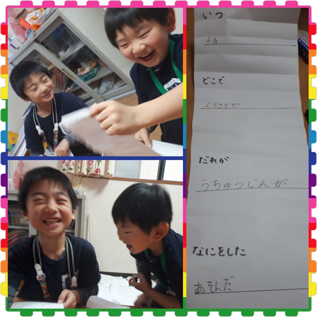 年長さんは“いつ、どこで、だれが、何をした”のゲームをしました。とても楽しかったようで『あと、100枚やりたい!』と言っていました(笑)