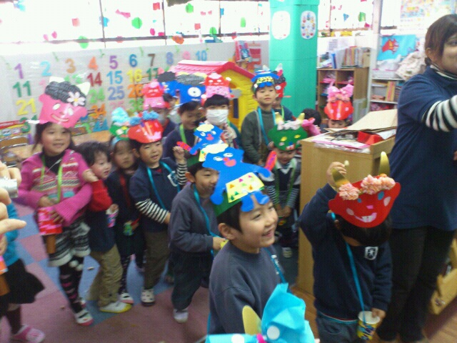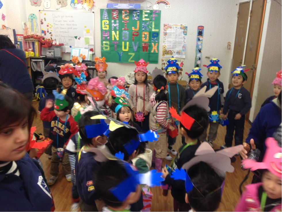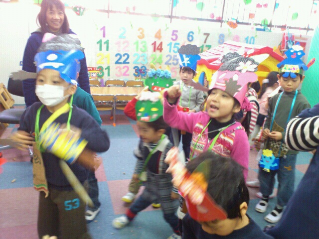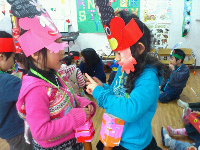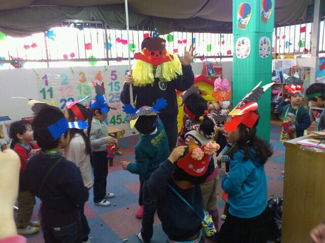 We have celebrated Mame-Maki this week,yesterday in school and today at the park. The children have made their mame-maki box where they can put their beans to use for throwing at the devils to go out and to throw upwards to welcome fortunes in. This was one of the Japanese culture where kids at school enjoyed celebrating especially when they are chasing the devils they are going to throw beans at. Although some small kids got scared of the scary faces it was still a very fun event!
