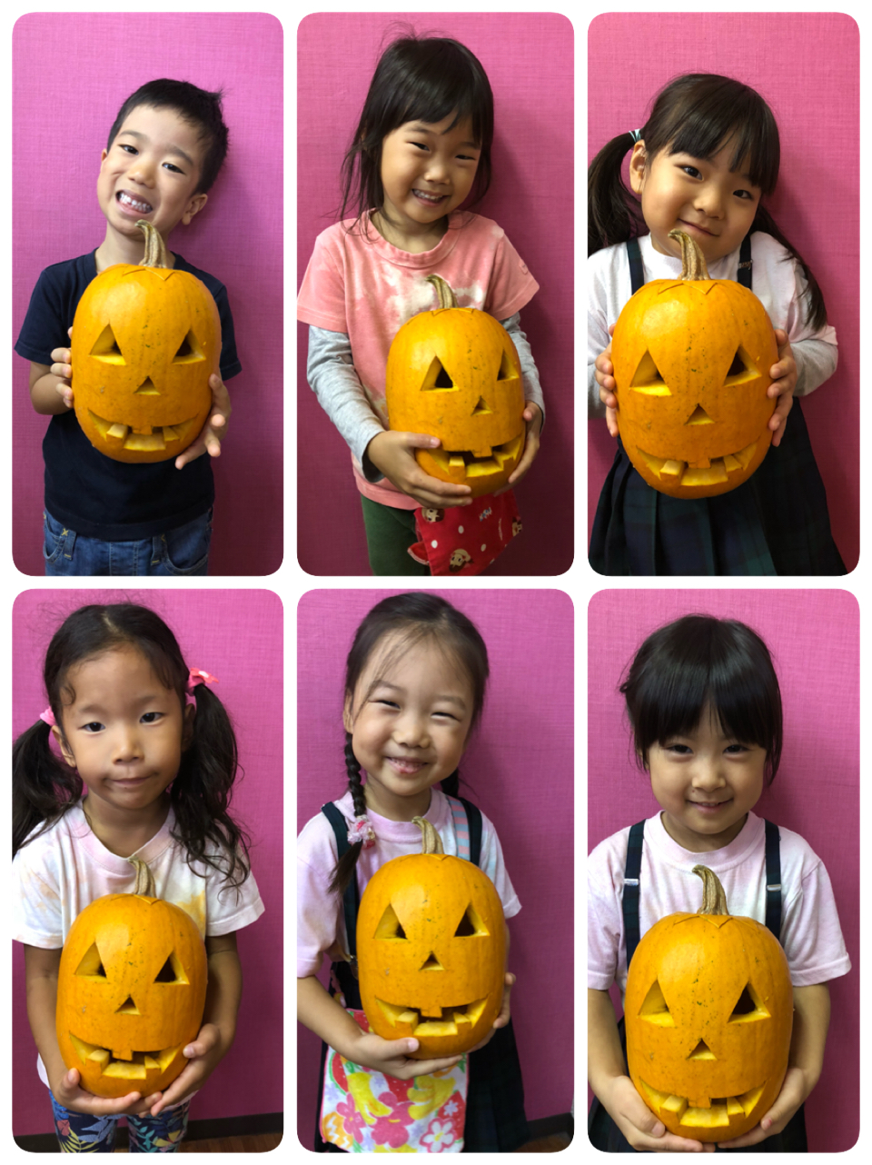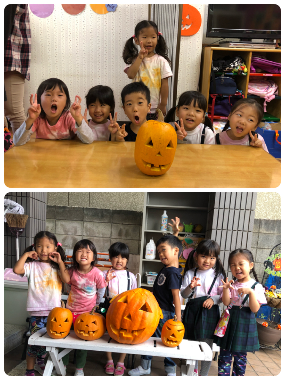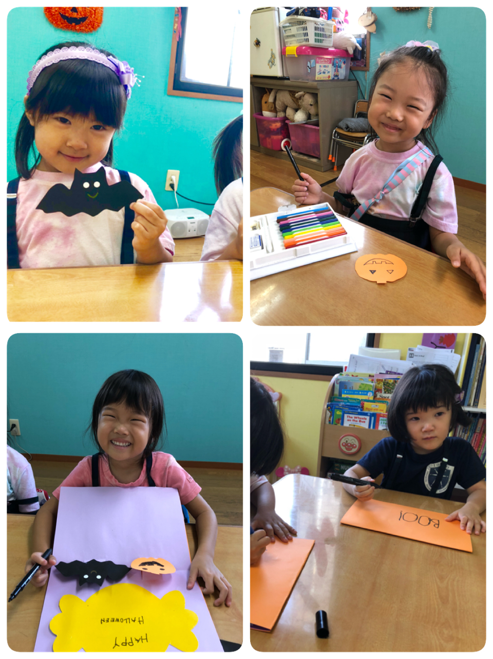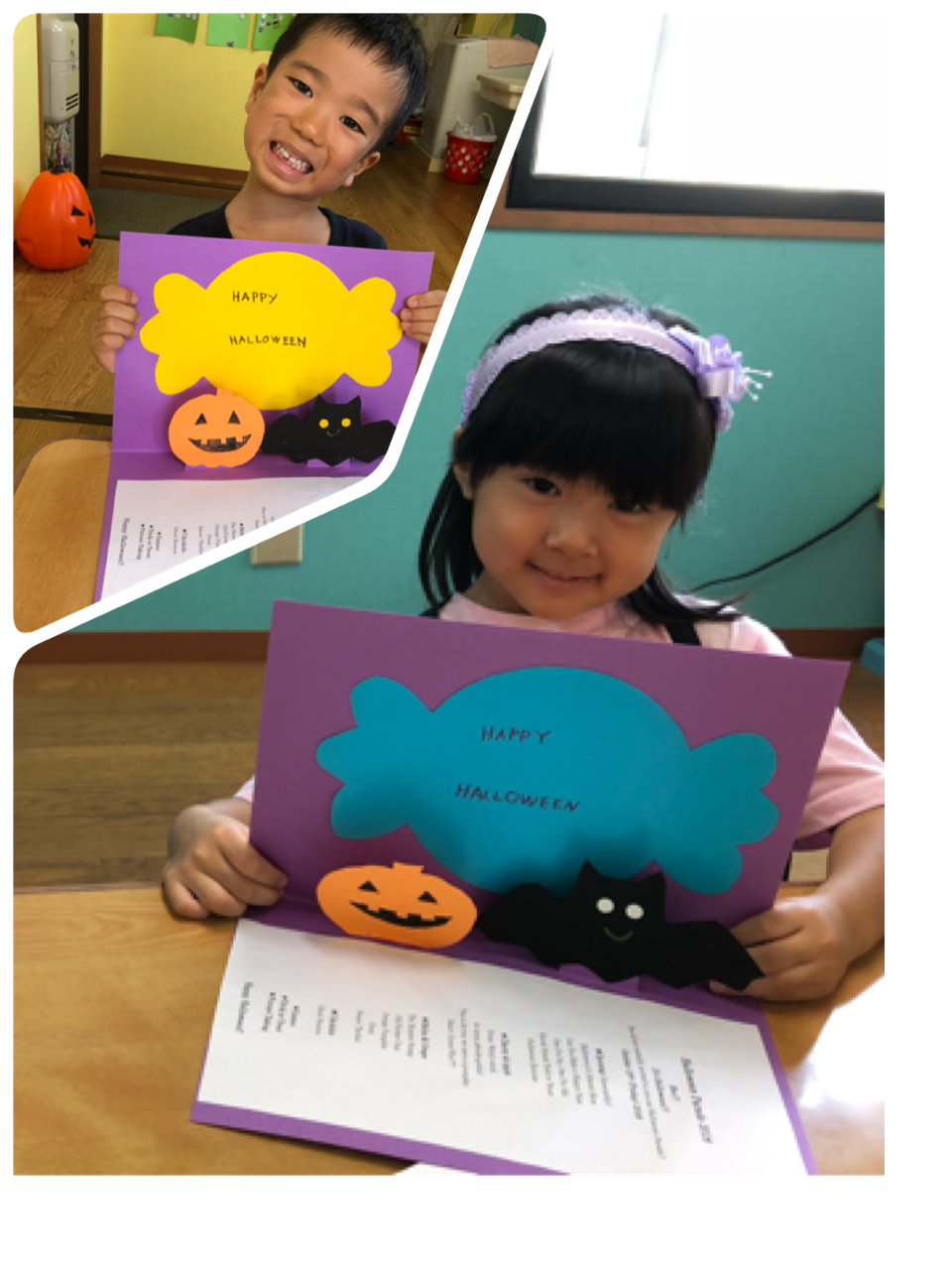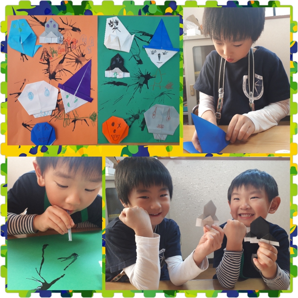 ハロウィンの折り紙を少し怖いクモの巣の画用紙に貼りました。袋折りが何度もでてきましたが、良くできていた2人!!特に教会の折り紙は難易度高いのにすごい!