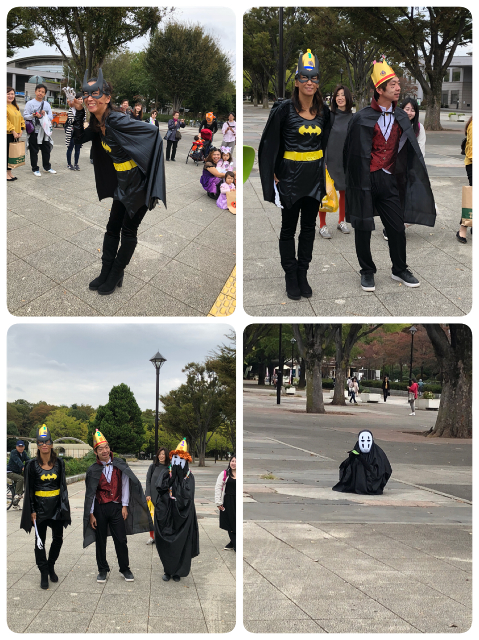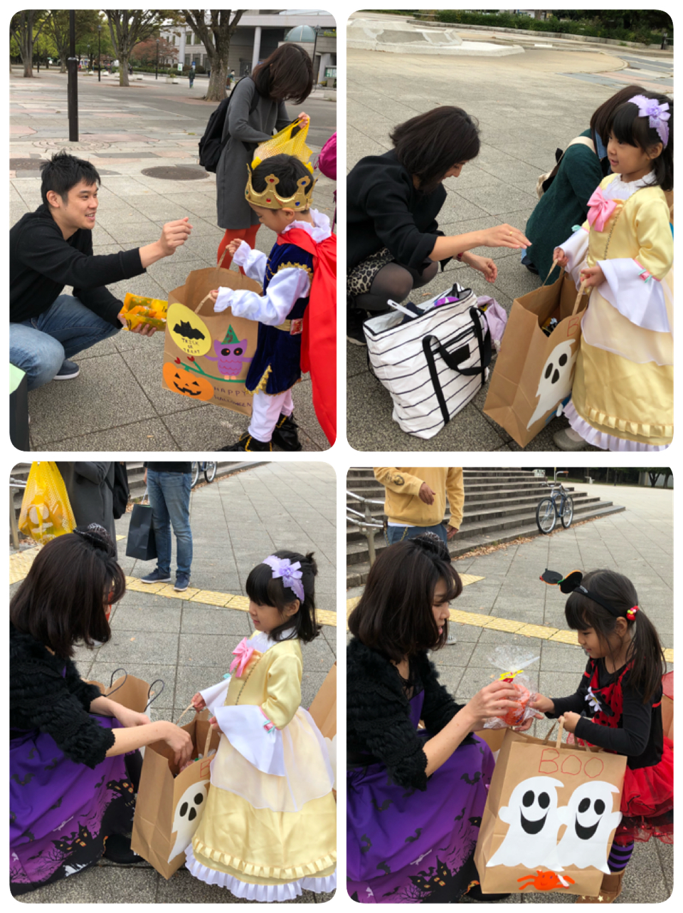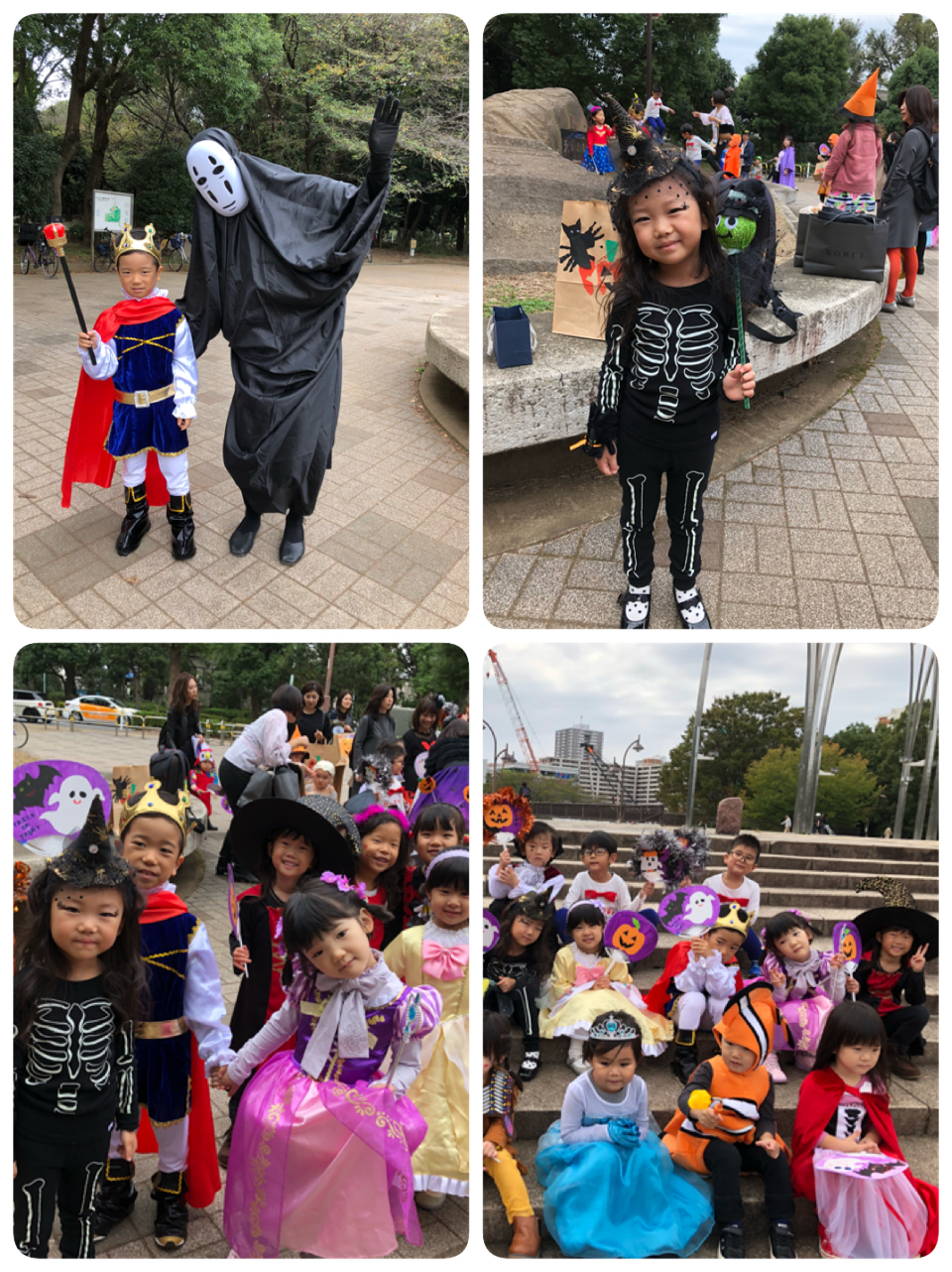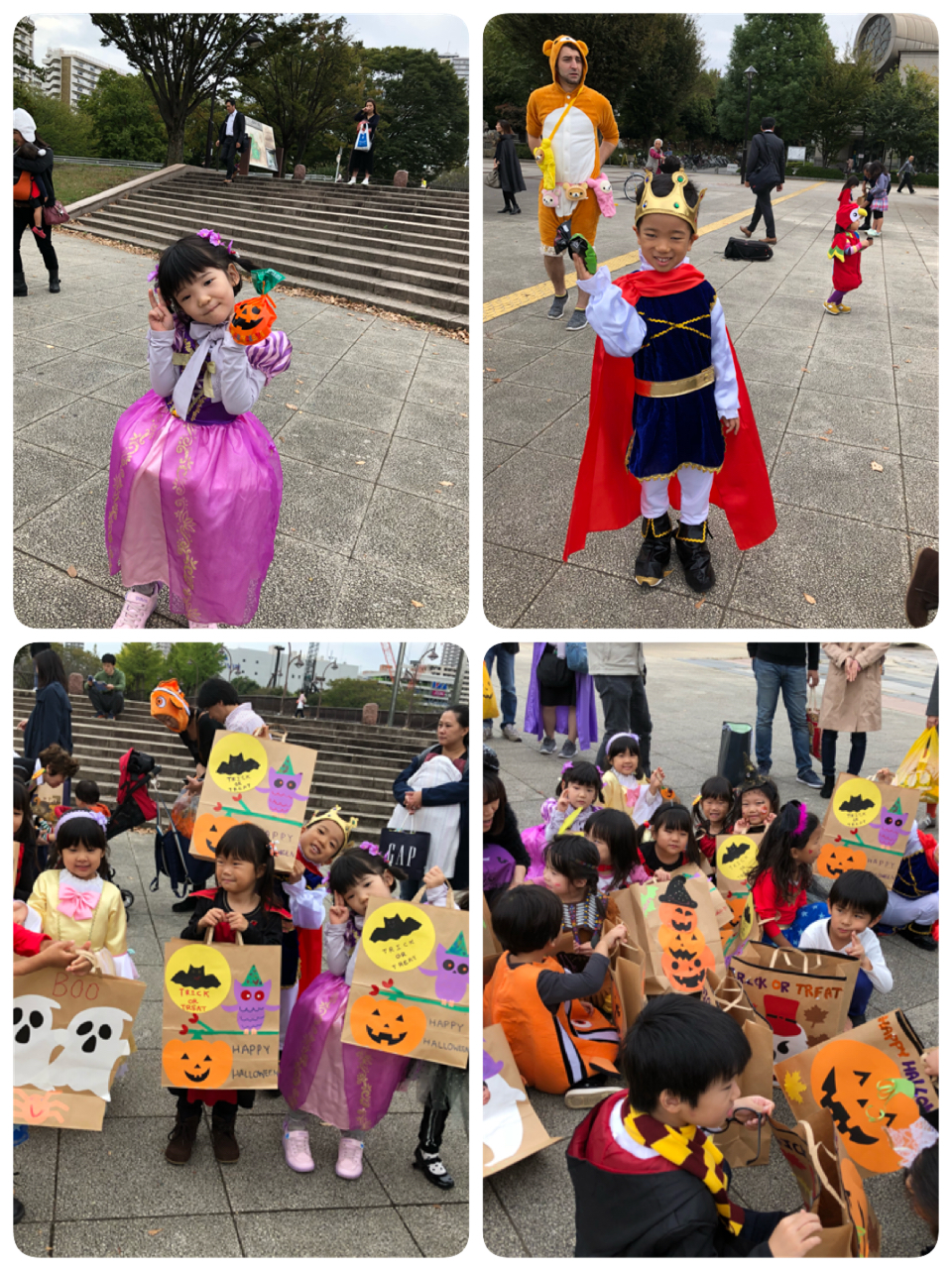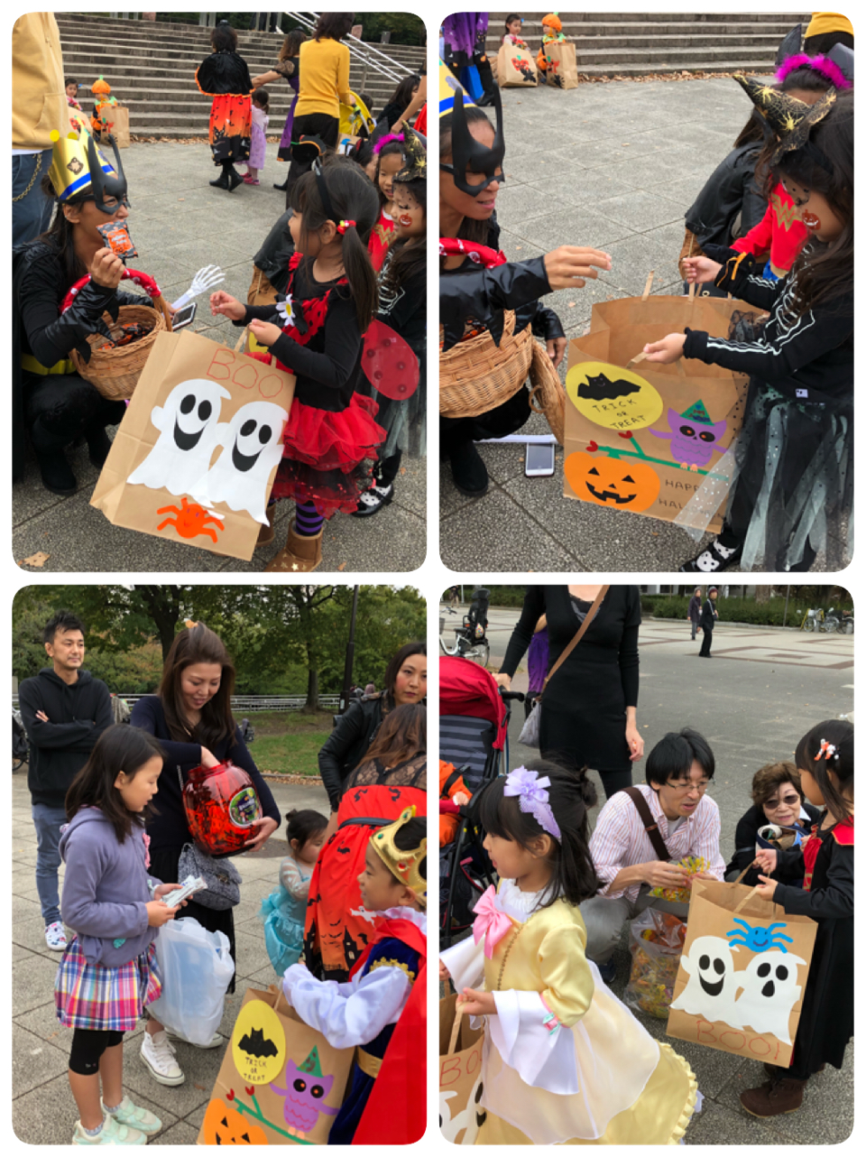ハロウィンの折り紙を少し怖いクモの巣の画用紙に貼りました。袋折りが何度もでてきましたが、良くできていた2人!!特に教会の折り紙は難易度高いのにすごい!