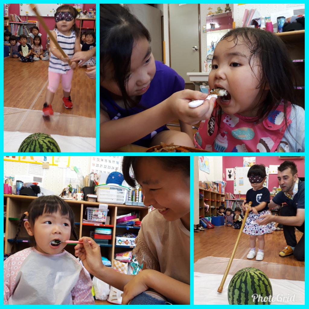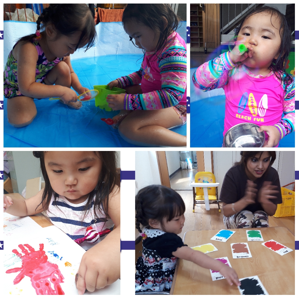 As we had super hot and humid days, we enjoyed splash and splash in the pool. In the afternoon, we printed our t-shirts and studied about ‘burnable’ and ‘non-burnable’ items.