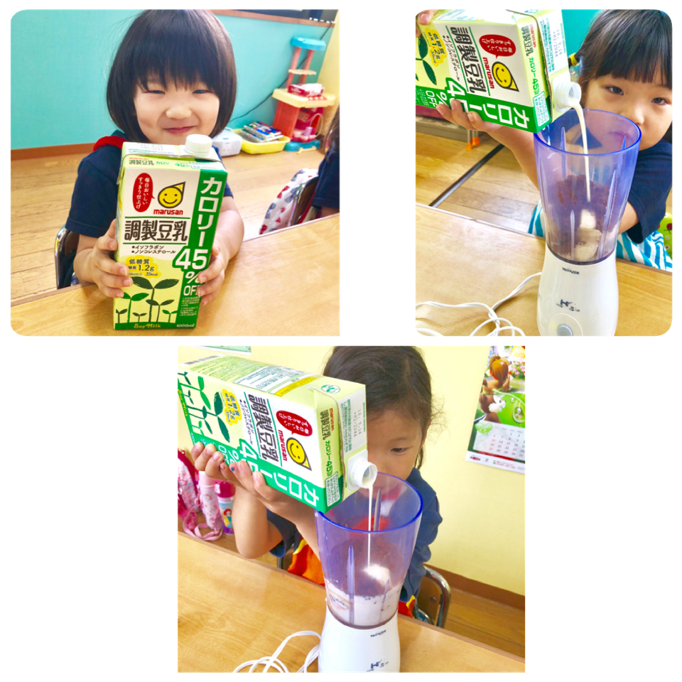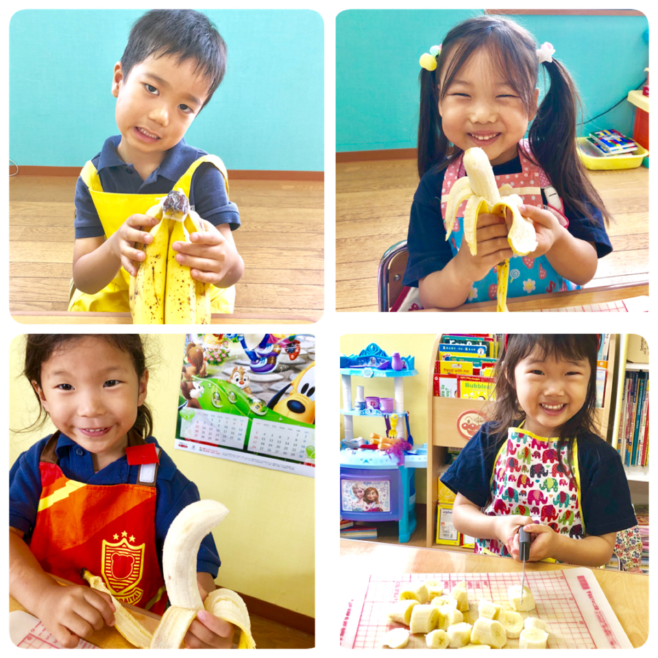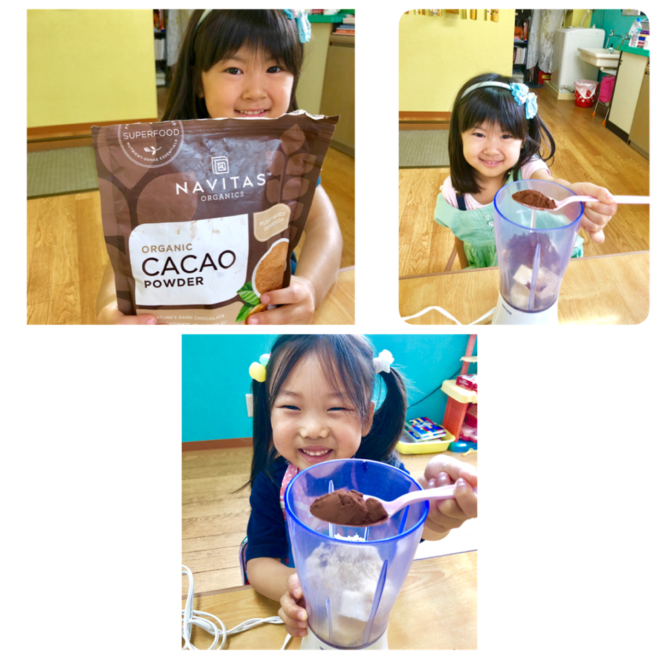 Today in the Melon Class, we made soymilk icecream. At first, we chopped the bananas and mixed it with soymilk,sugar and cacao powder. After that, we made smoothies with it and pour in our cups to refrigerate. All the kids actively took part in making icecream and it was really fun.