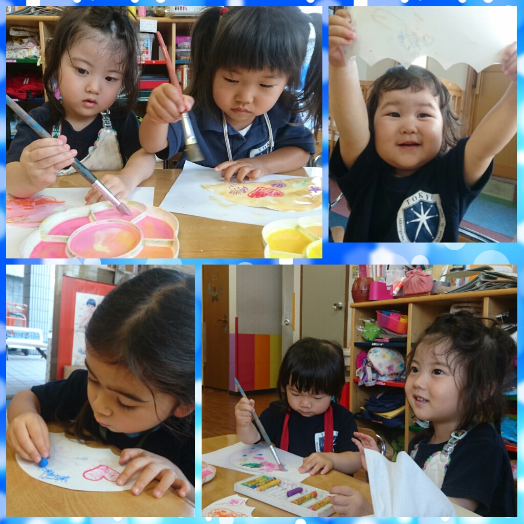 絵の具を見せるとみんな手をお膝の上に置き、楽しんで塗っていました♪