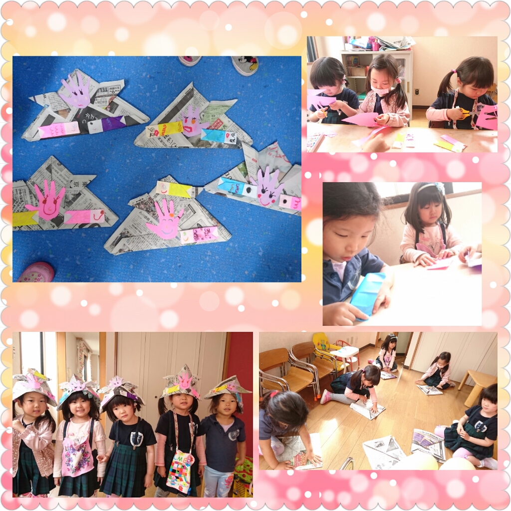 年中さんは、大きな新聞紙の折り紙で素敵な兜を作りました。