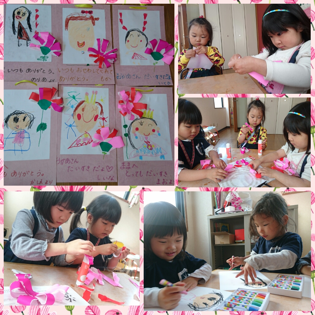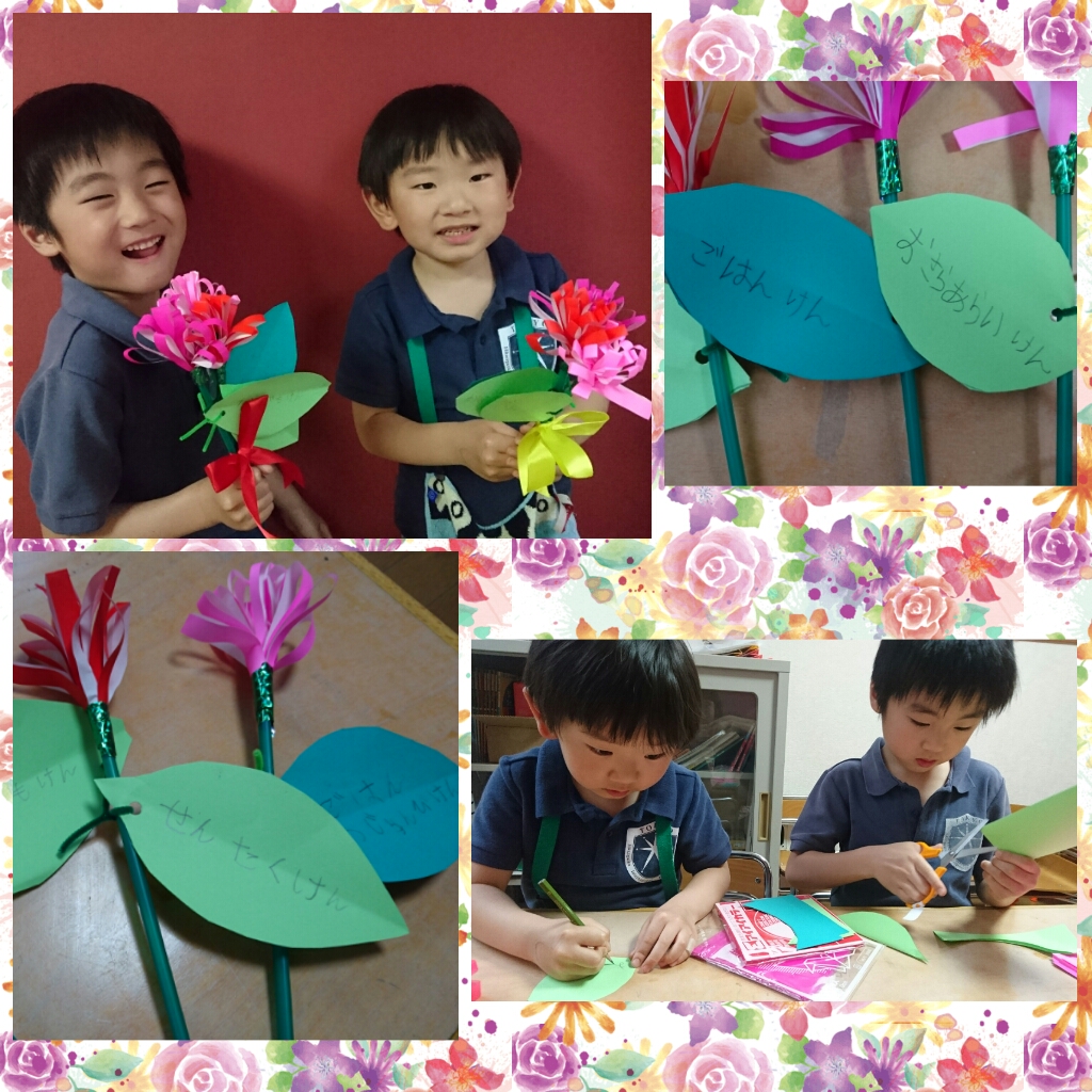昨日の年長さんは、母の日製作。お手伝い券付きのカーネーションの花束をつくりました。