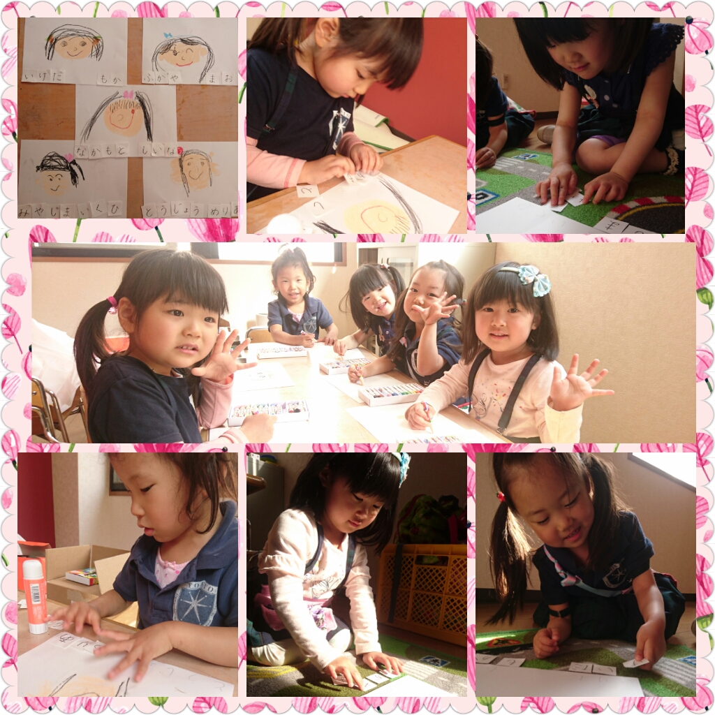 年中さんは、平仮名の導入として自分とお友だちの名前を文字カードを使って楽しくお勉強しました。