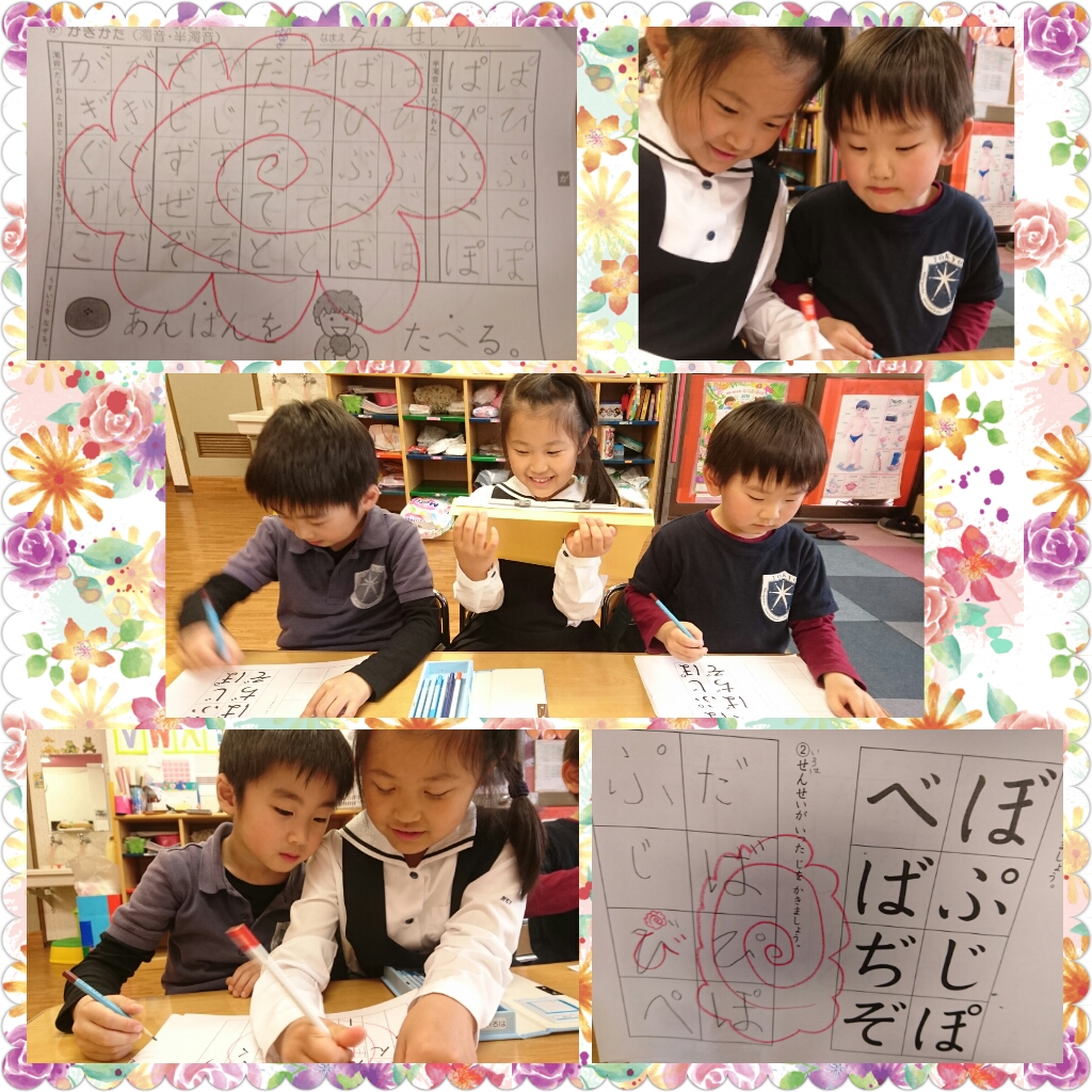 年長さんは、大好きな“I先生”が帰ってきて大喜び♪Rくんは何度もJUMPして飛びついてHUGをしていましたよ(^^)大好きなI先生に花丸をもらい上機嫌な2人は濁音、半濁音を学びました。
