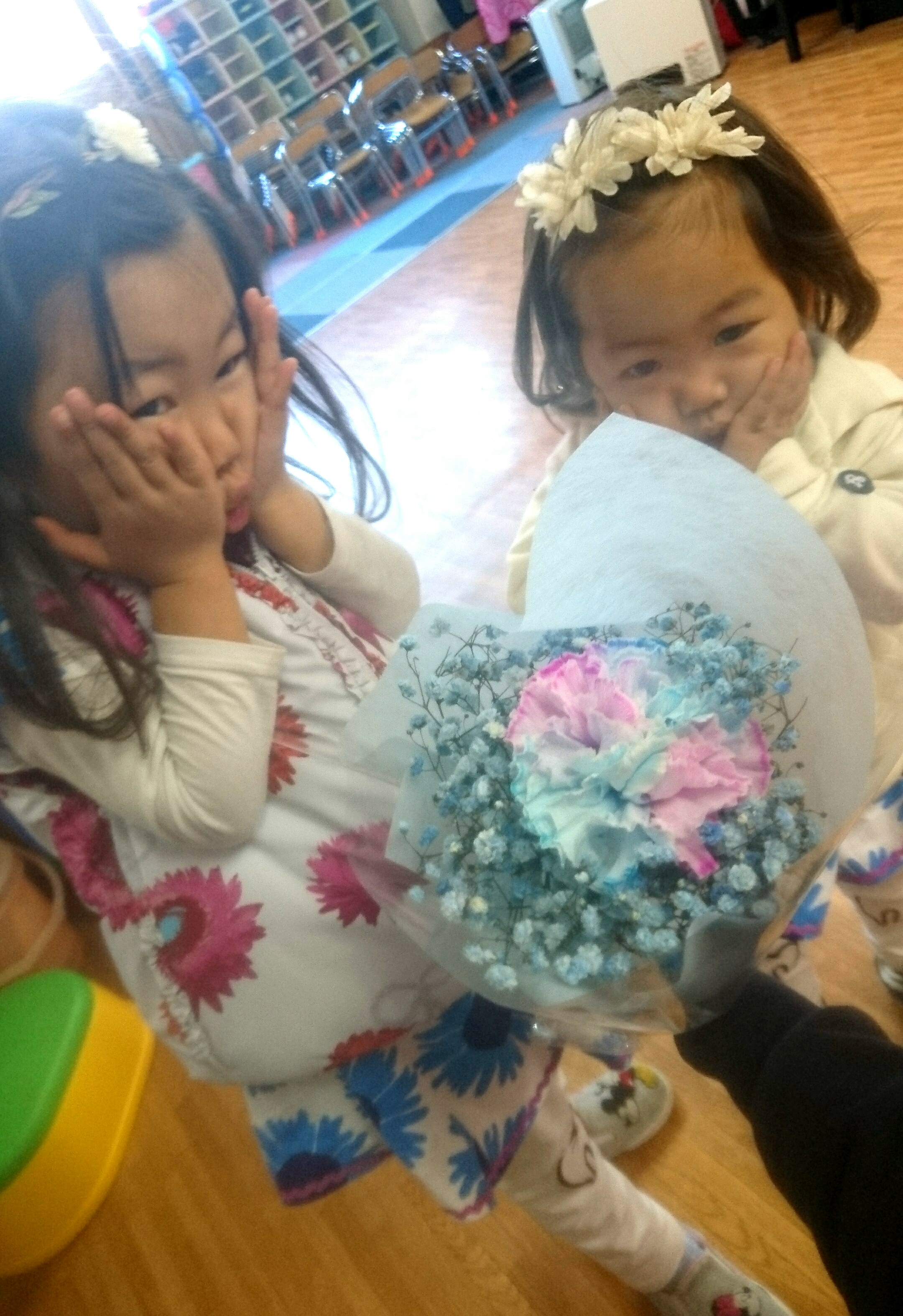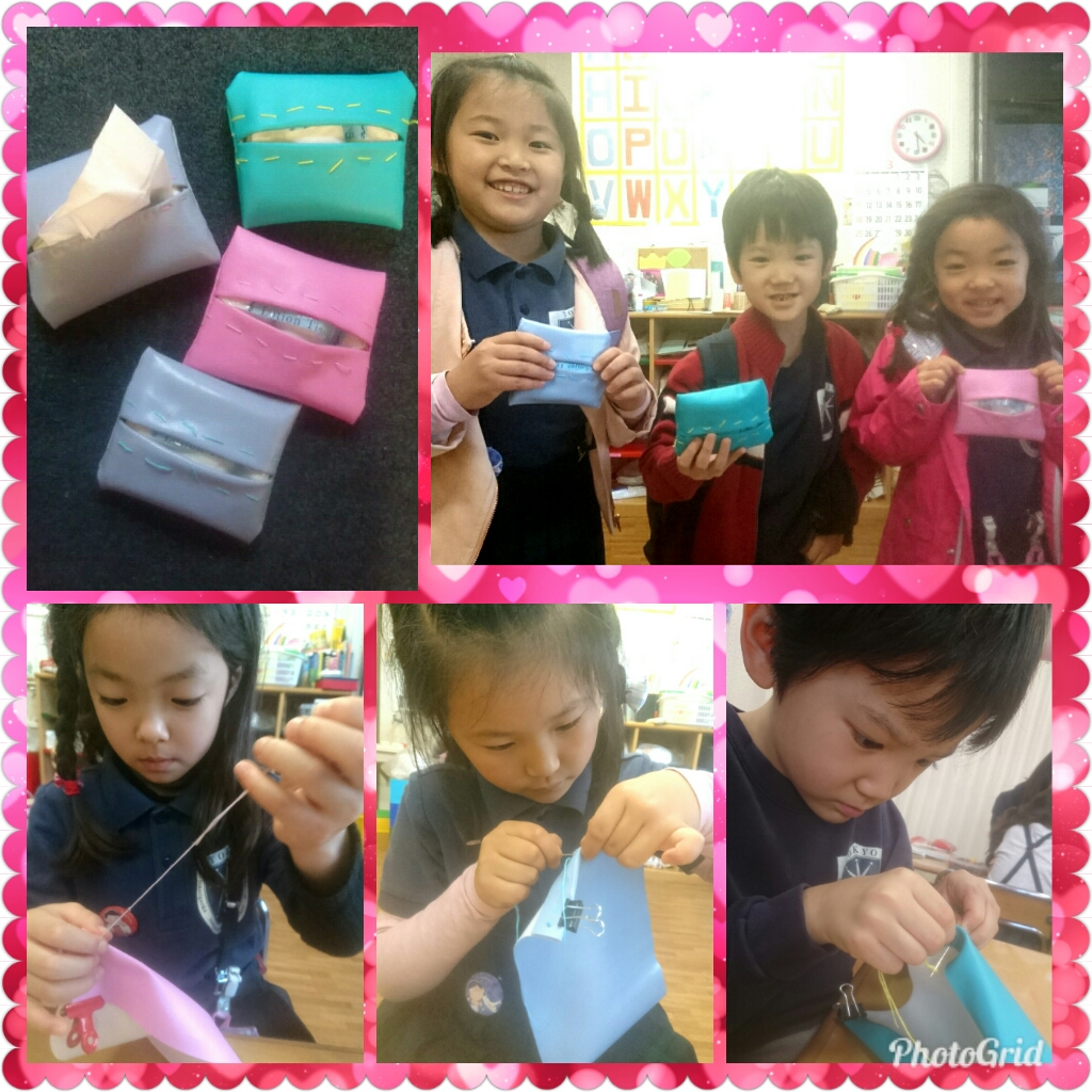 年長さんは、Iちゃんのリクエストにより“裁縫”をしました。卒園間近の3人、卒園式の日に涙や鼻水が出てもいいように、ティッシュケースを作りましたよ!来週で最後です( ノД`)…