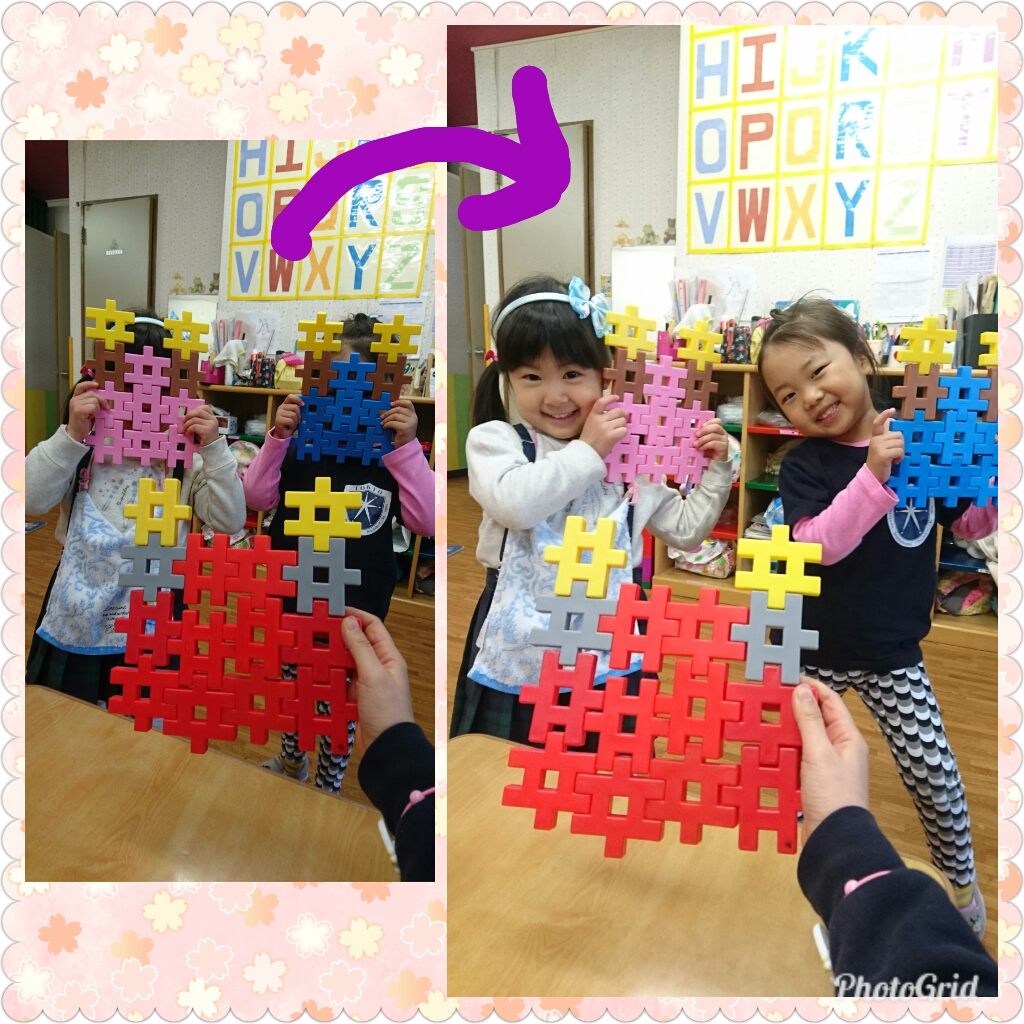 豆まきの日に、「Wow, Nice」と作ったブロックを誉めると「Not, NICE」とお返事したMちゃん。なななんと、鬼のお面を作ったのでした!上手で、ビックリ
