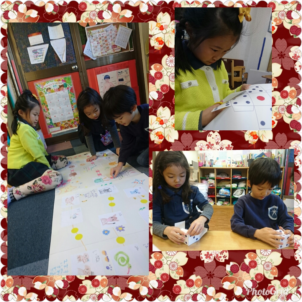 年長さんは巨大サイコロを作り、先週完成させたスゴロクを3人分繋げて、遊びました。