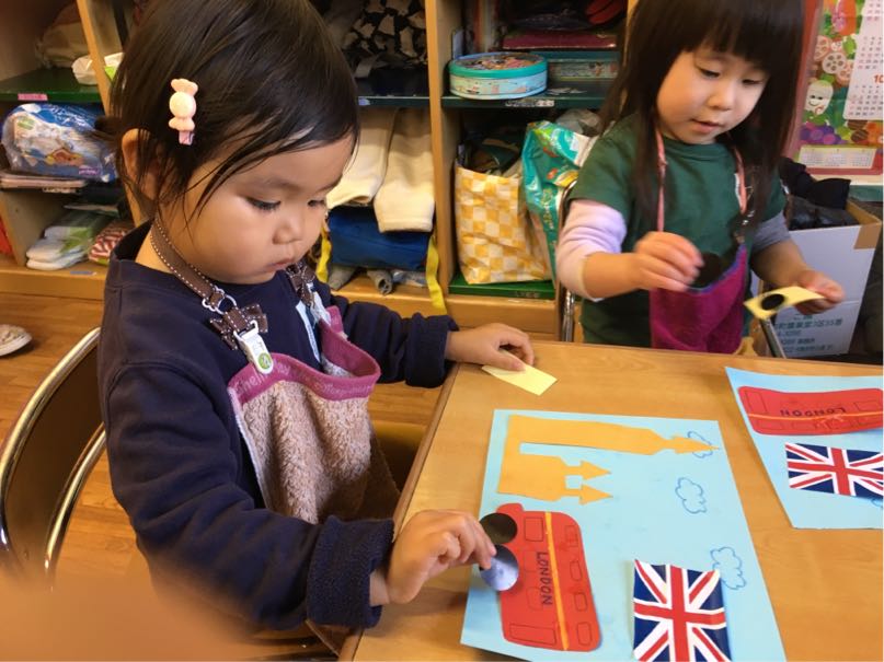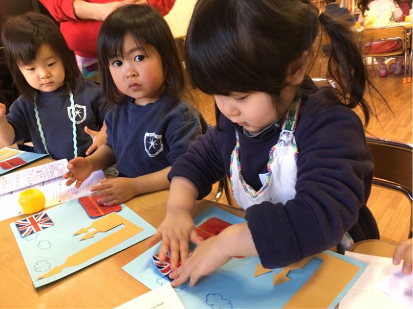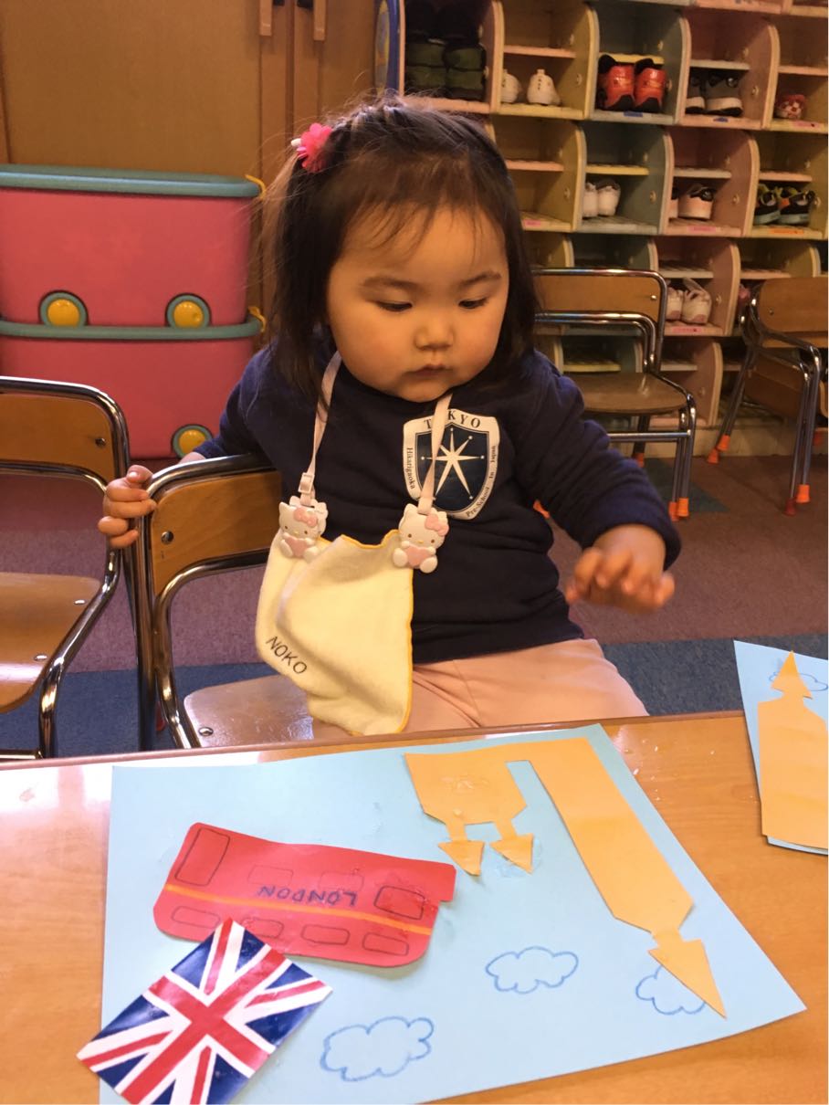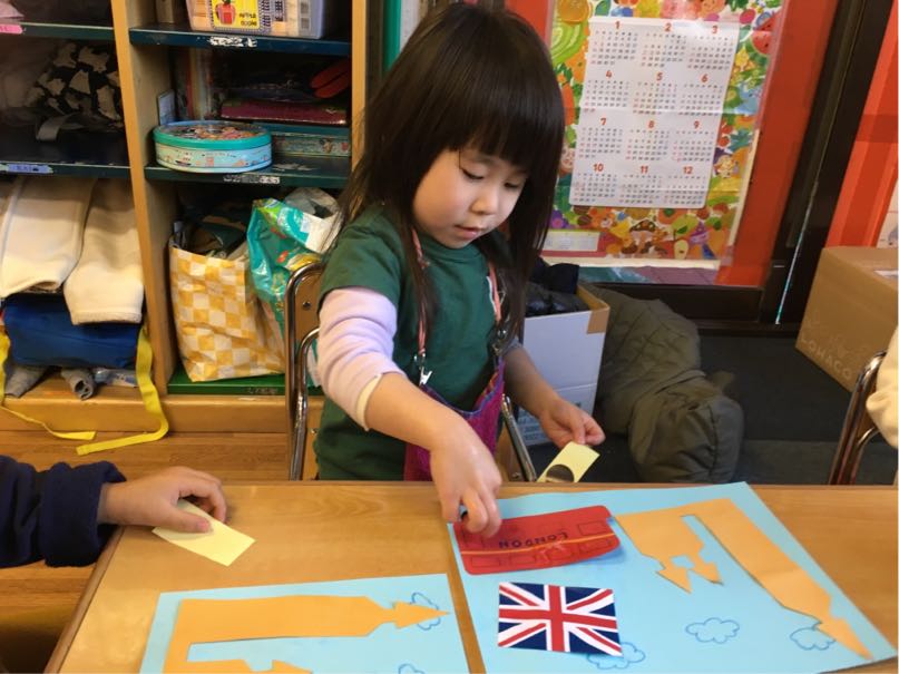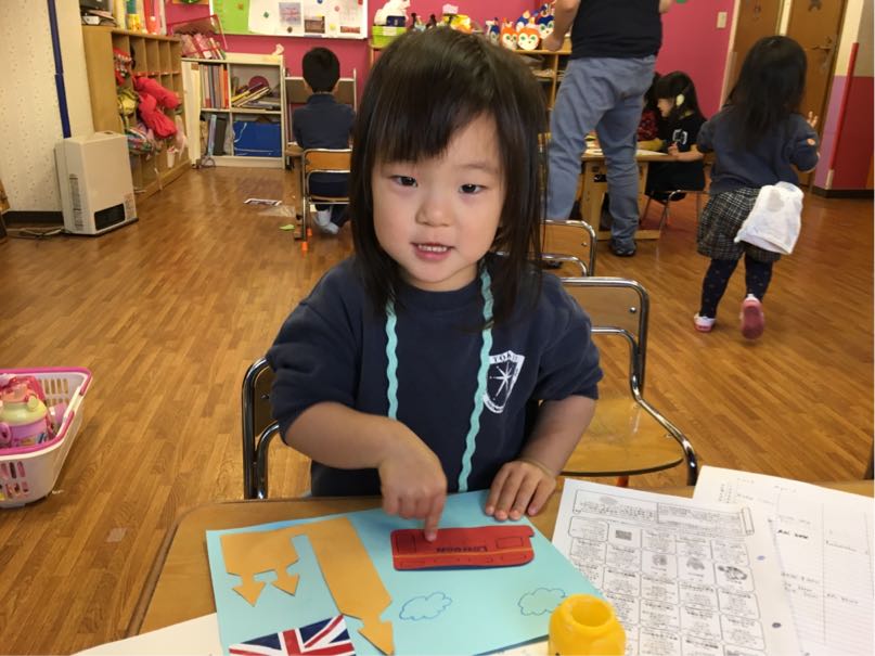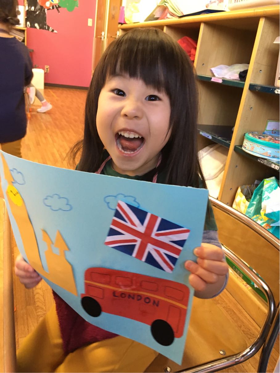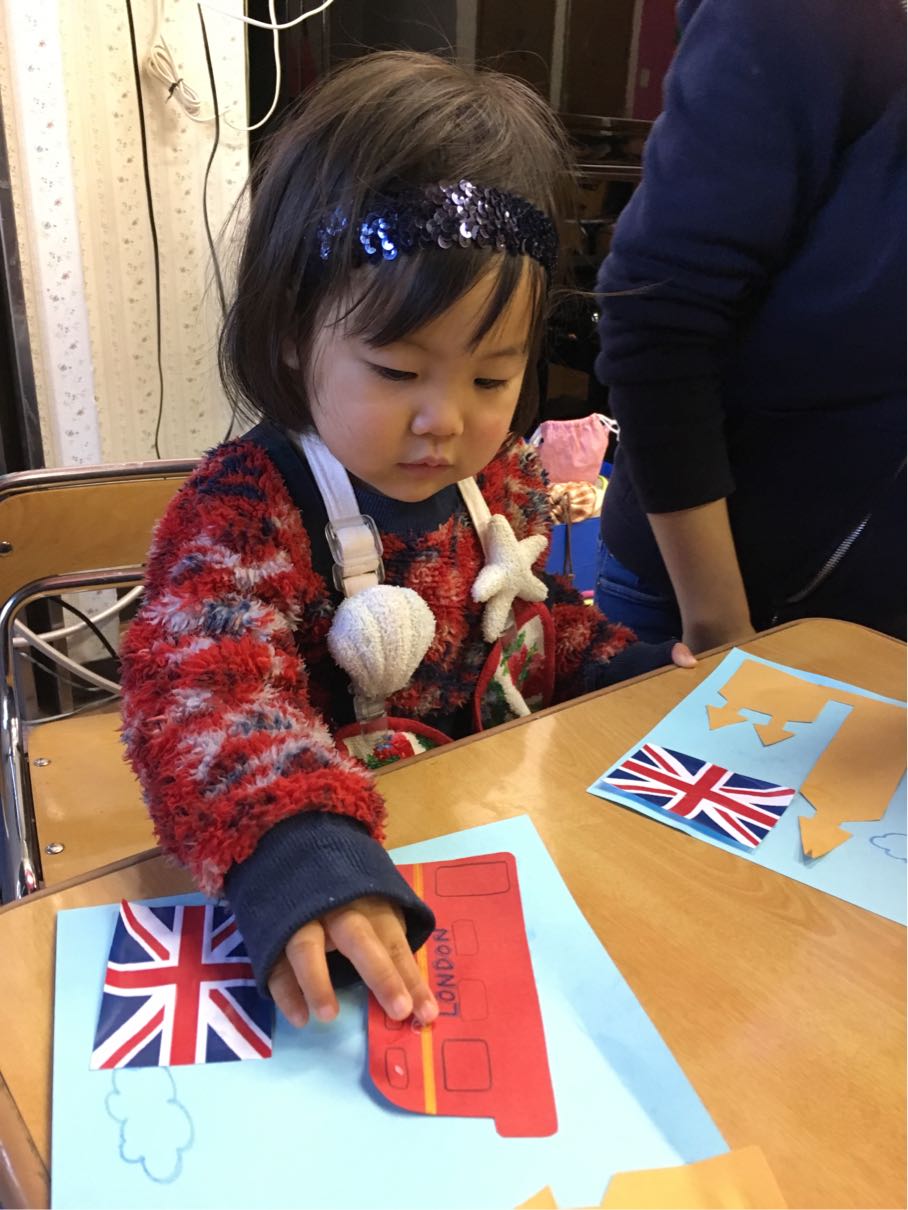 チェリーさんは、イギリスの有名な建物と乗り物について学び、ユニオンジャックと共にはり絵を楽しみました。