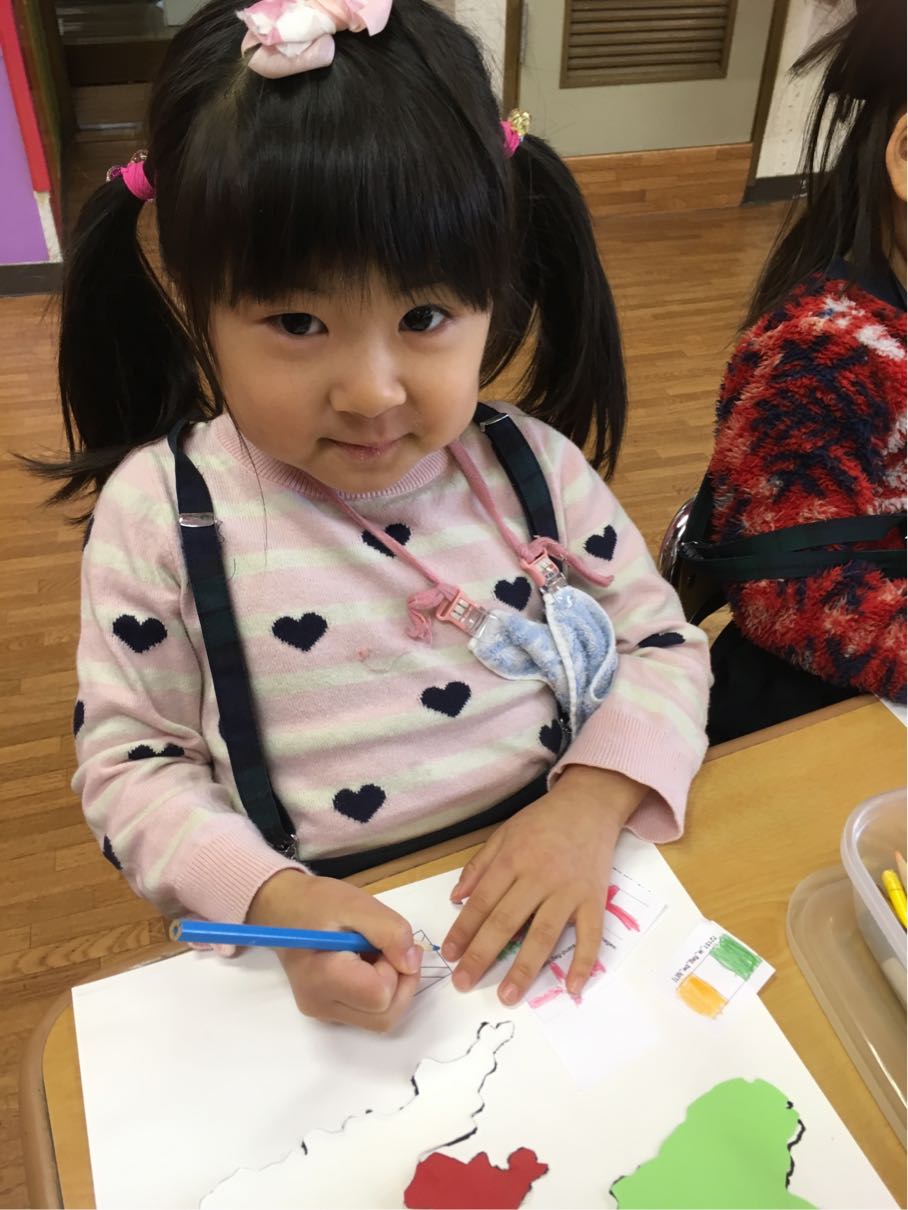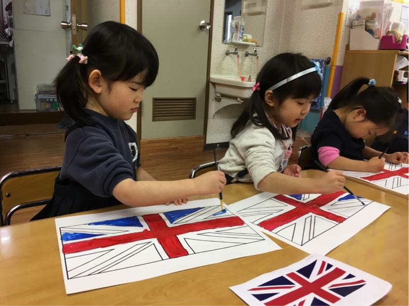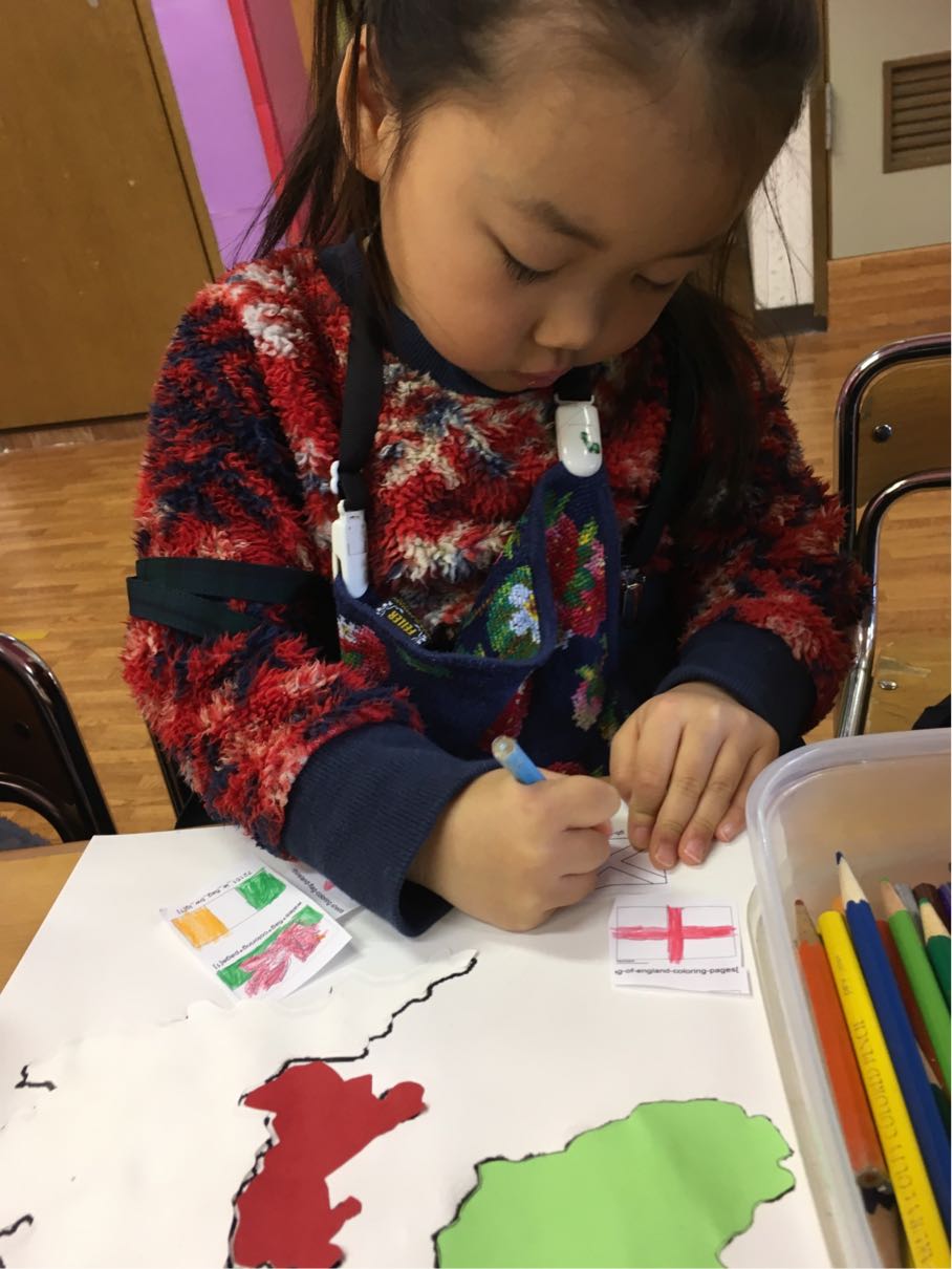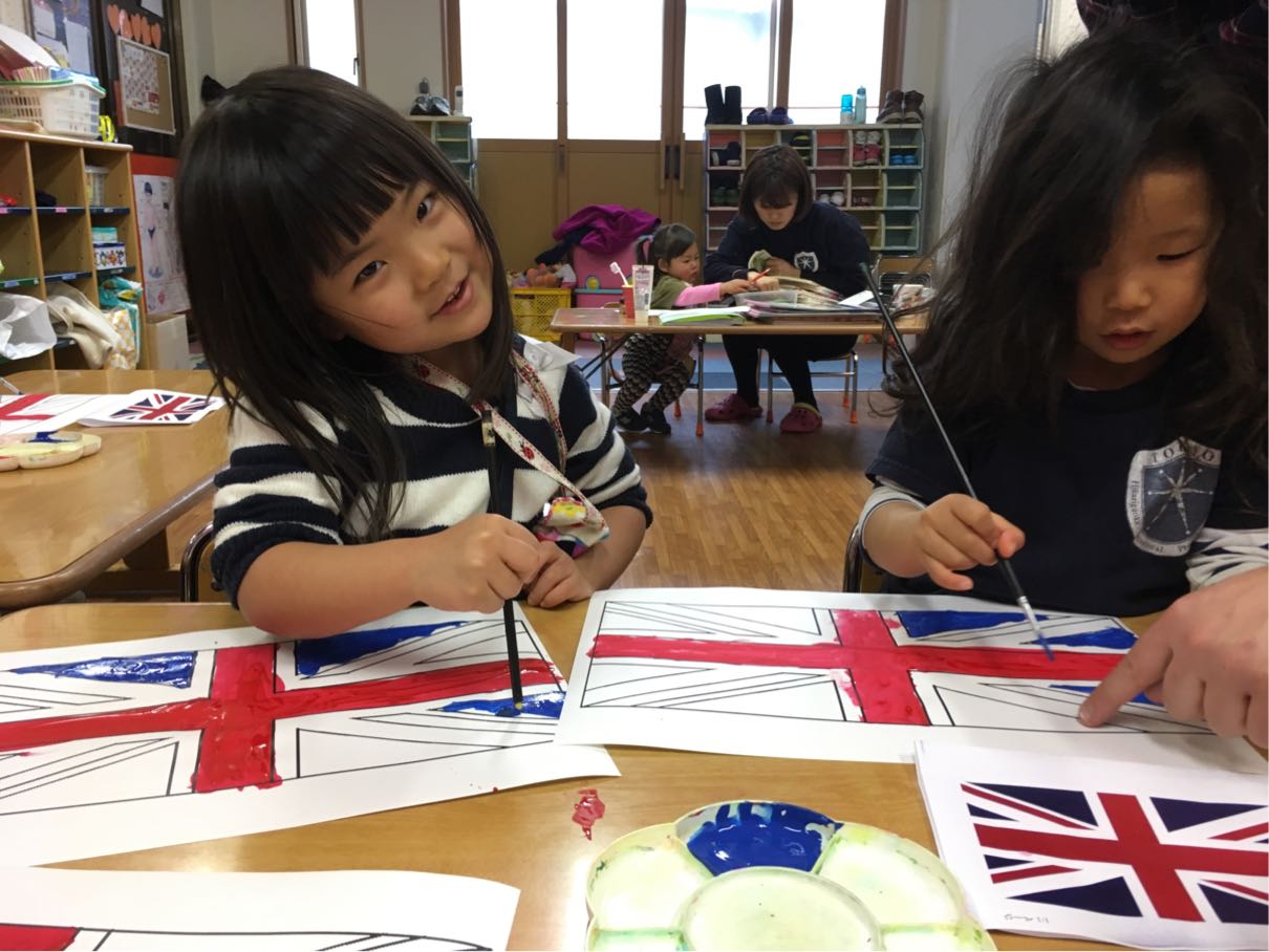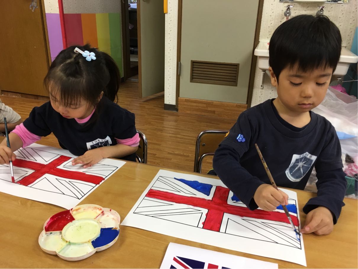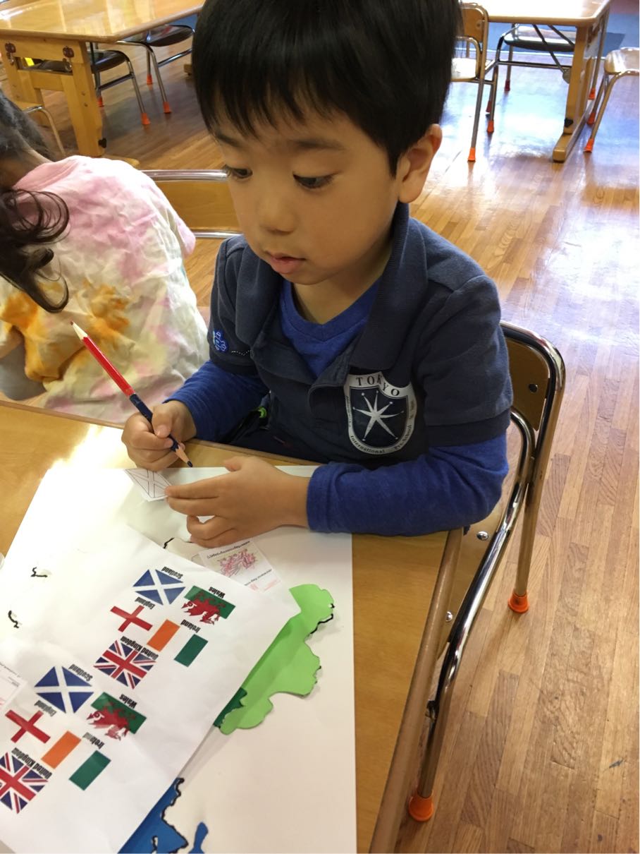 チェリーさんは、イギリスの有名な建物と乗り物について学び、ユニオンジャックと共にはり絵を楽しみました。
