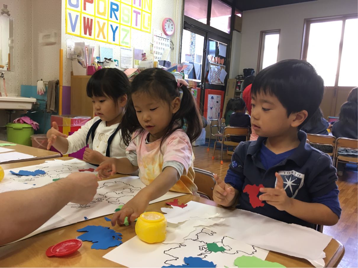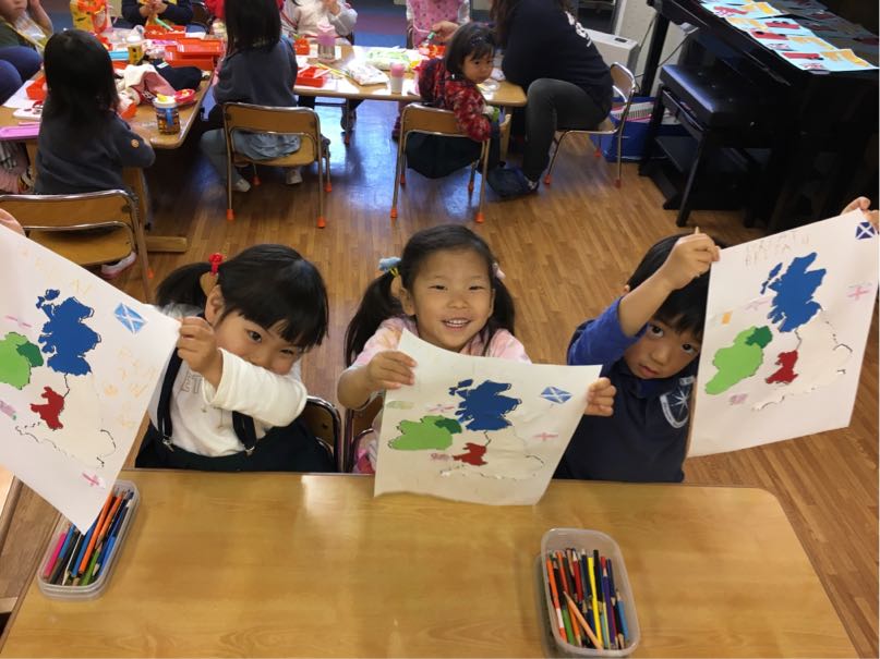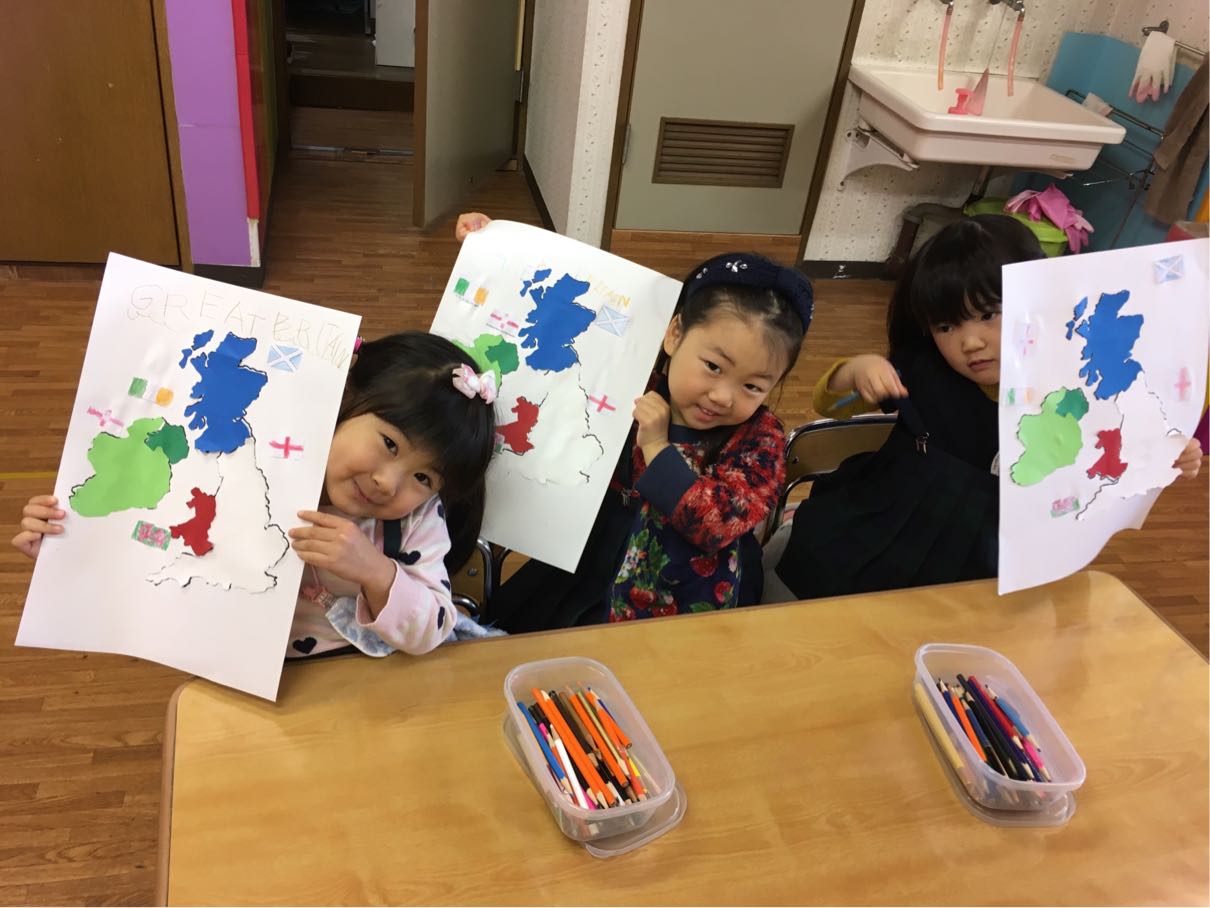 アップルさんは、イギリスについて学びました。イングランド、スコットランド、ウェールズ、ノーザンアイランド、アイルランドがあって全部でイギリスなんだよと。イギリスのお話を聞いた子供達は”I want to go there!” ”I like Mr.Robert!”と大興奮でした。そして素敵な地図の出来上がり〜〜!