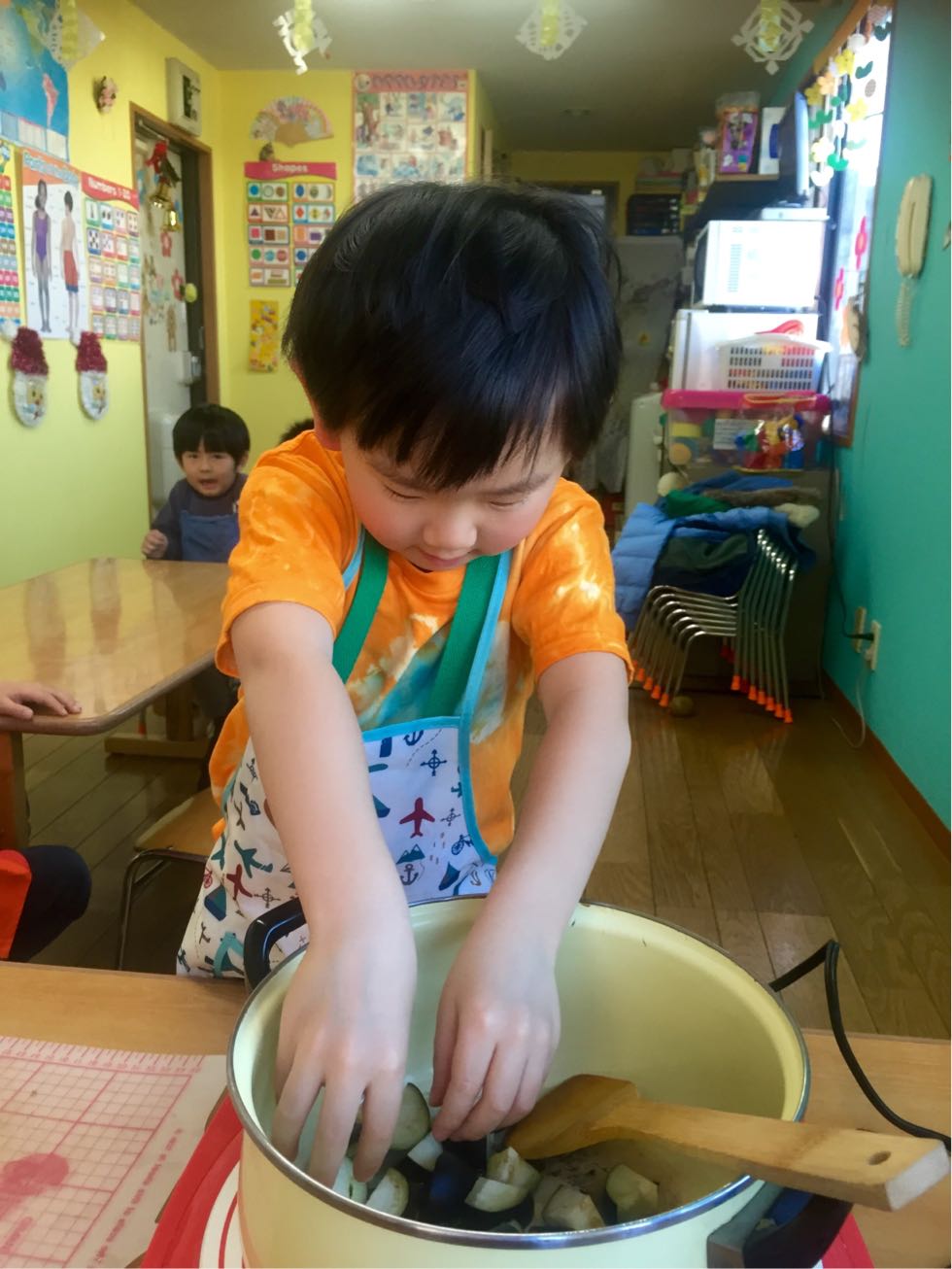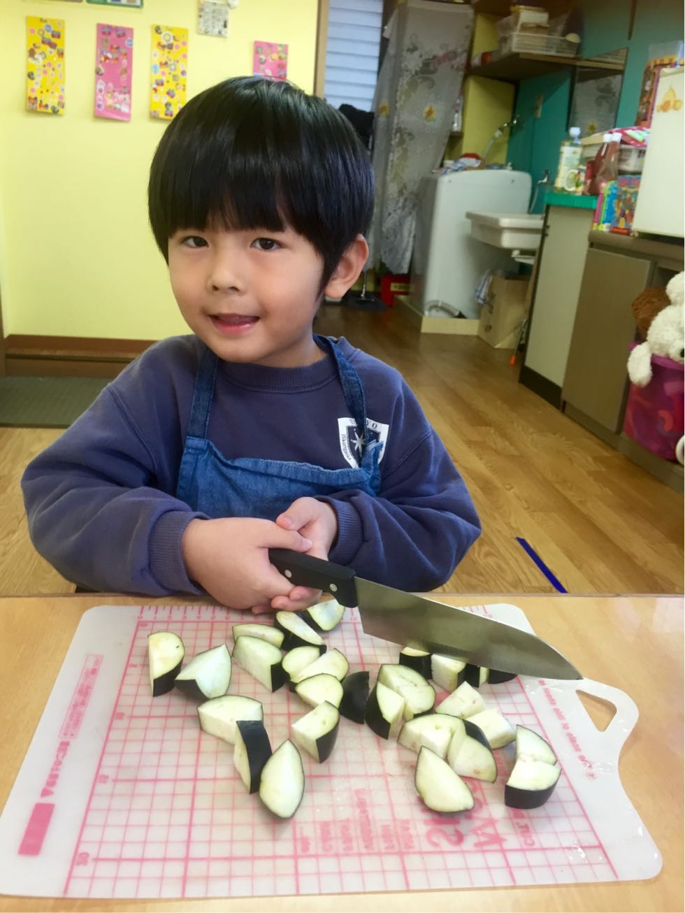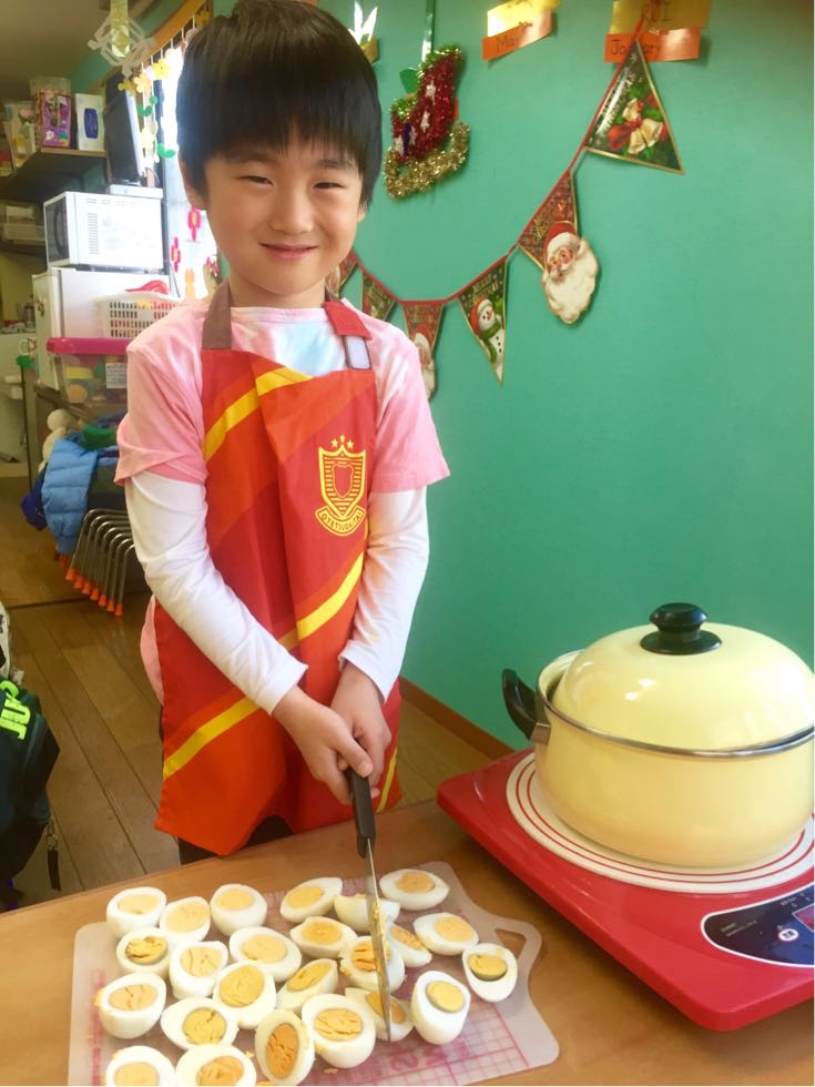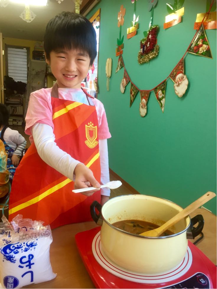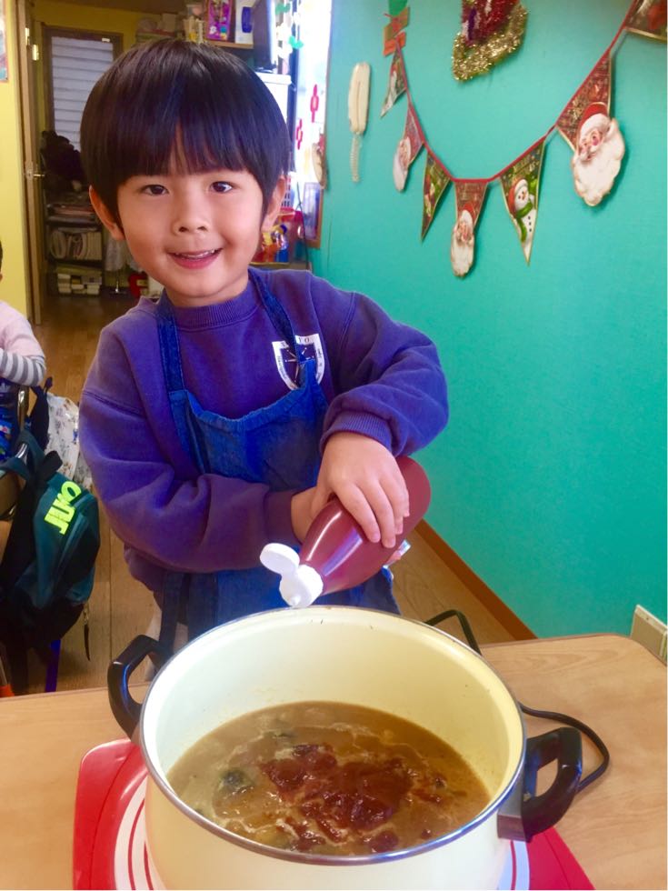 To keep the cold at bay, we made curry with eggs and a lot of vegetables in the Melon Class. It was fun to cook together and the kids were actively joined. We chopped the vegetables ,mixed the spices and made delicious curry.
