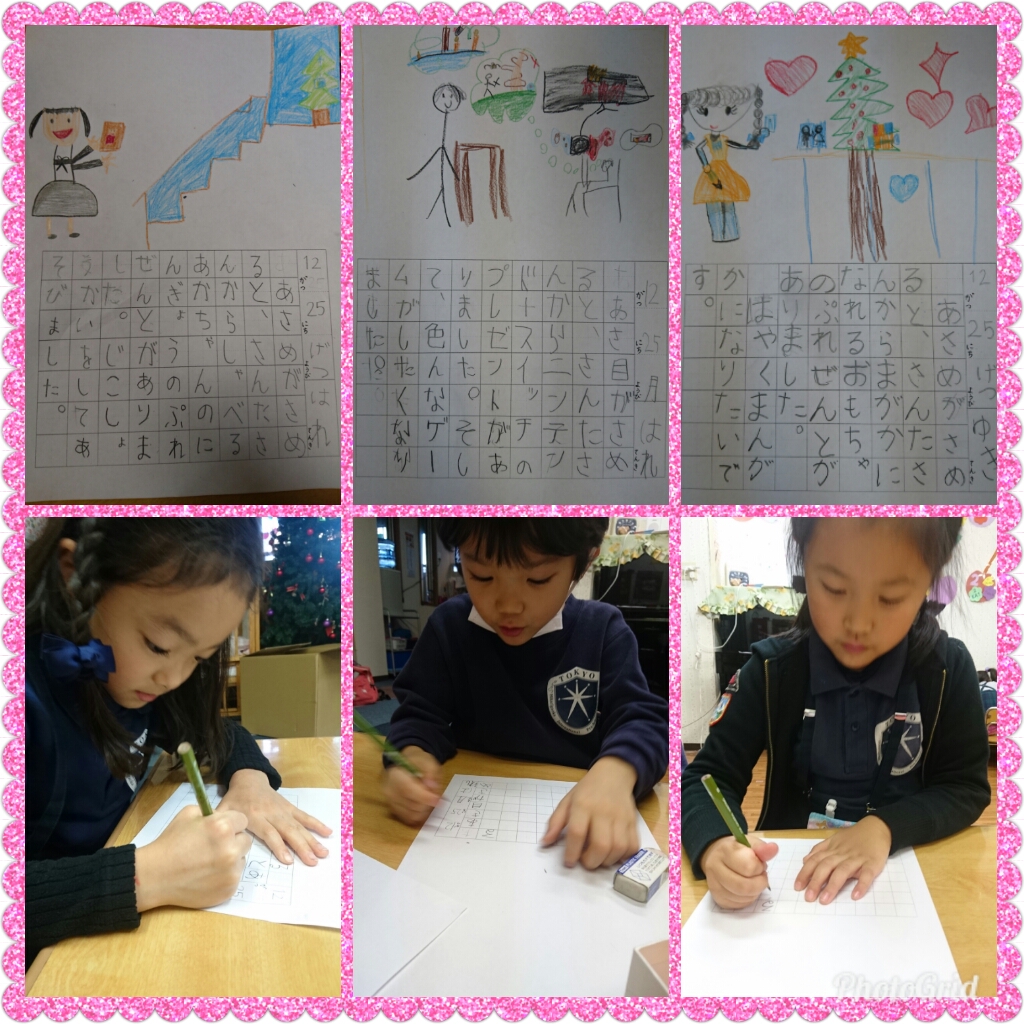 「Christmasの夜、サンタさんから~をもらいました。……」そんな3人の冬休みの宿題は、絵日記。どんなことを書いてくるのか楽しみです。