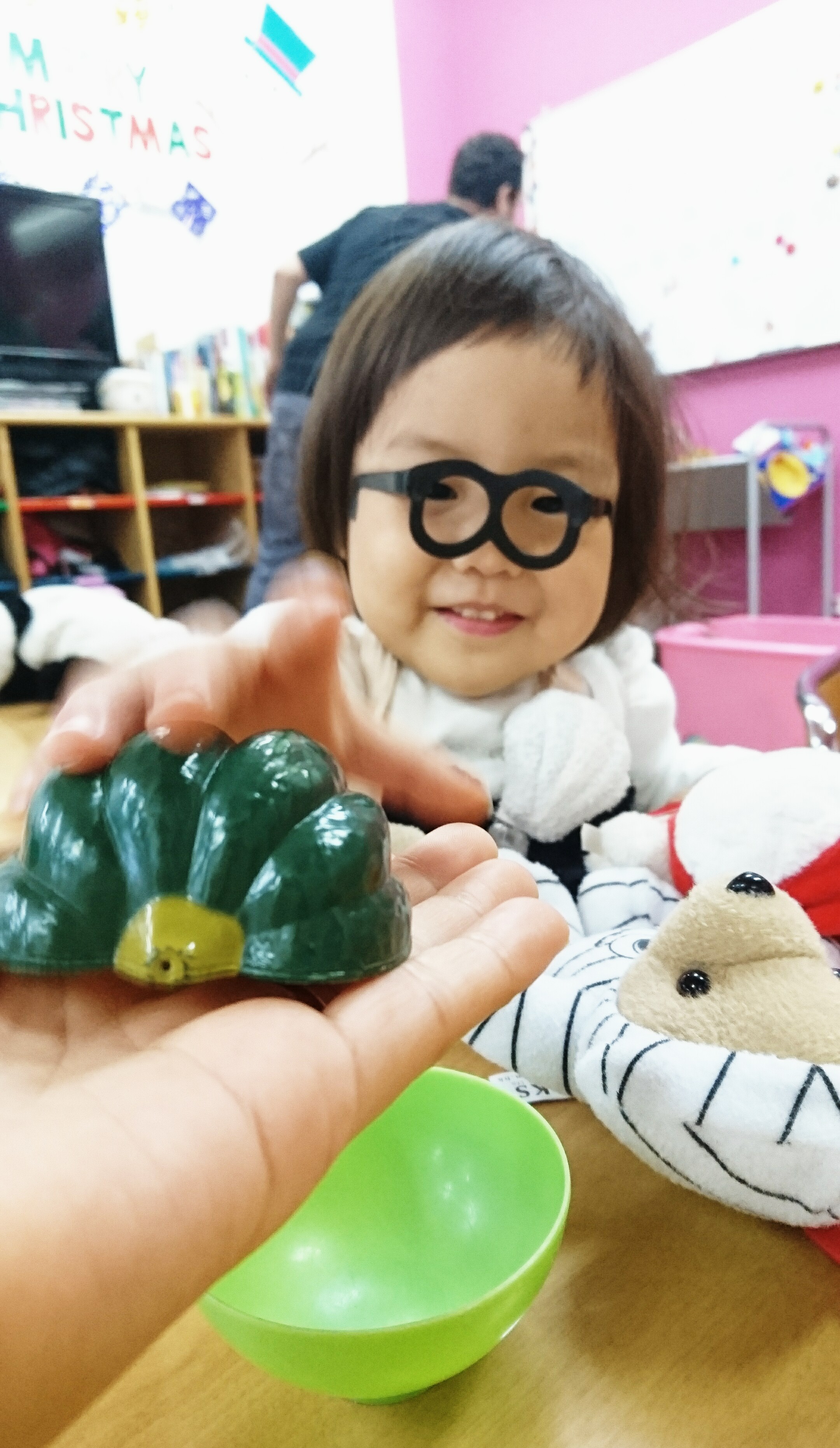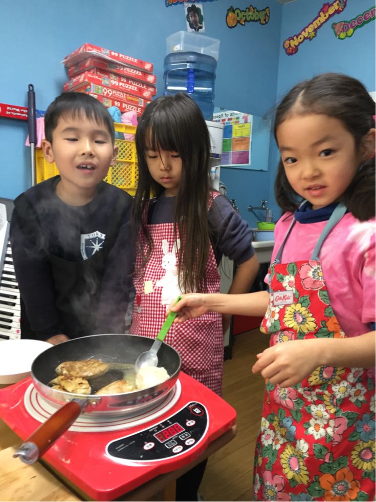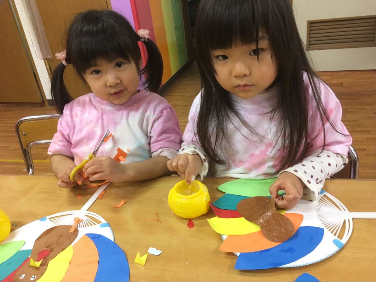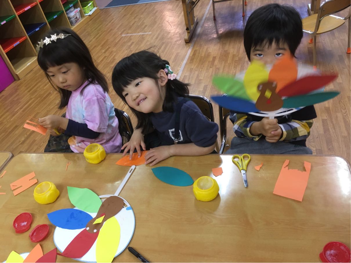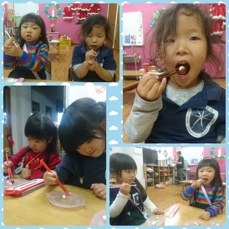 年少さんは、みんな大好き「りとる美味しいクラス」をしました。頭の上の日本語のボタンならぬ、おへそのボタンを押して「頂きます」から始まるお箸の使い方を学ぶこのクラス。お菓子のために、みんな必死にお箸の使い方を学んでいました。