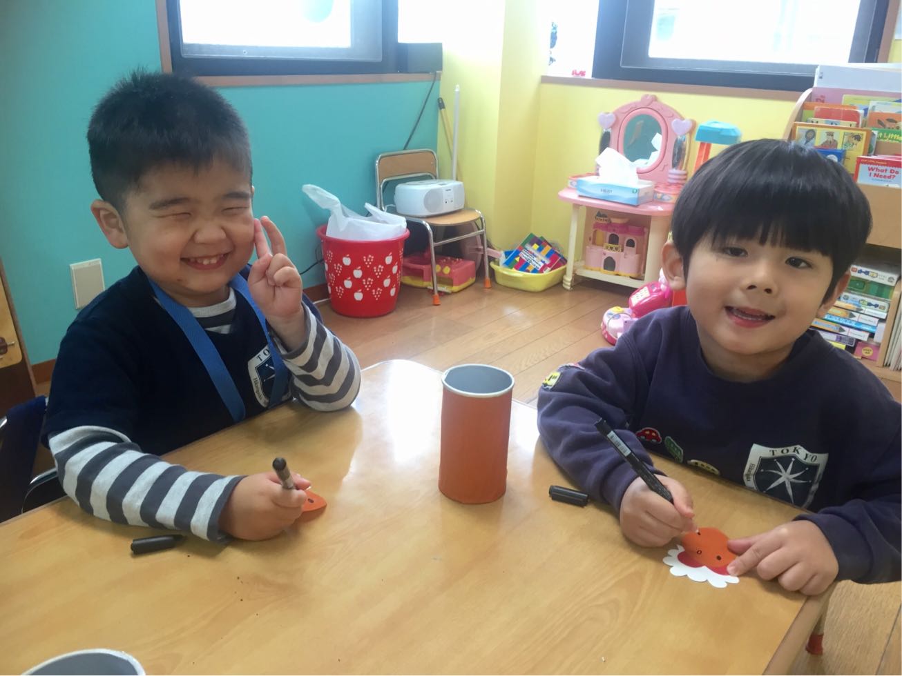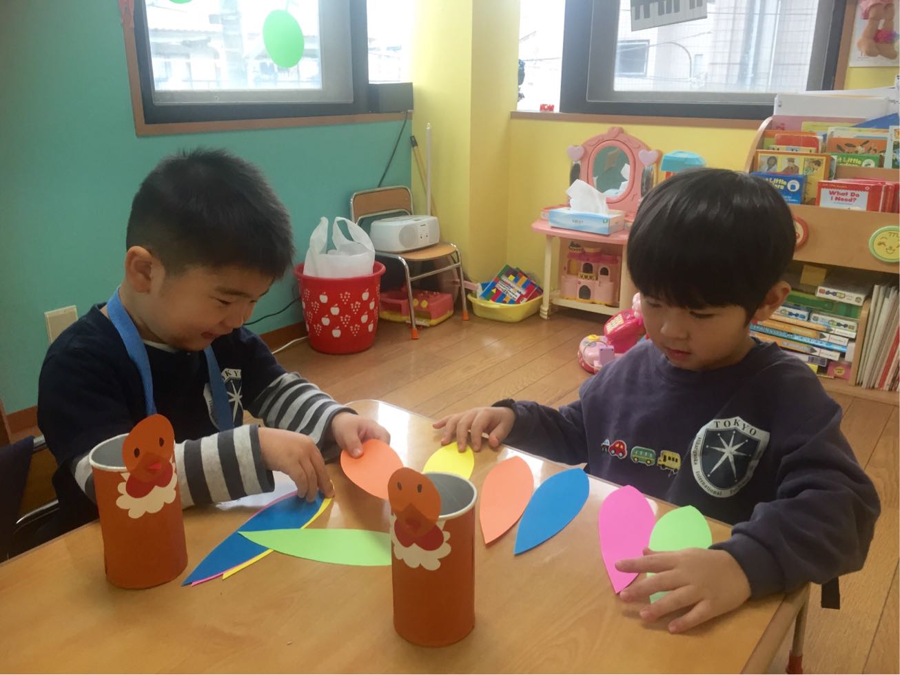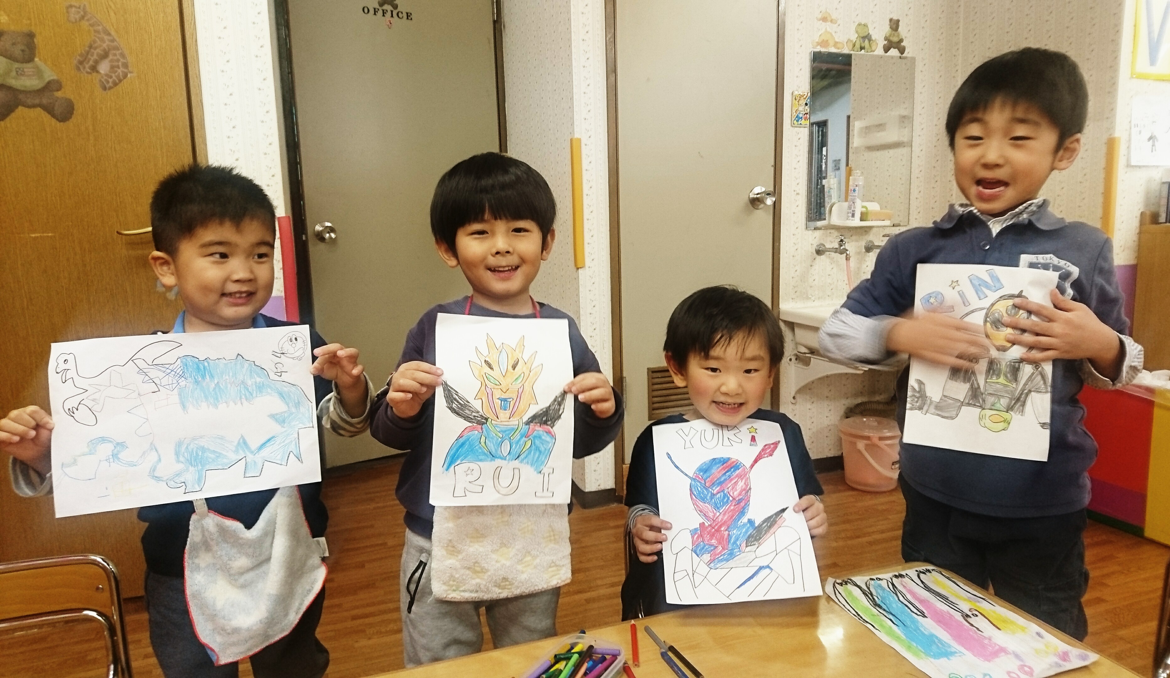 ピアノの待ち時間中BOYSにぬりえを作ってあげました。日頃は専らブロック派のBOYSも、大好きなキャラクターを前に集中して丁寧に塗っていました!もっと塗りたくて帰りたがらない子もいましたよ♪