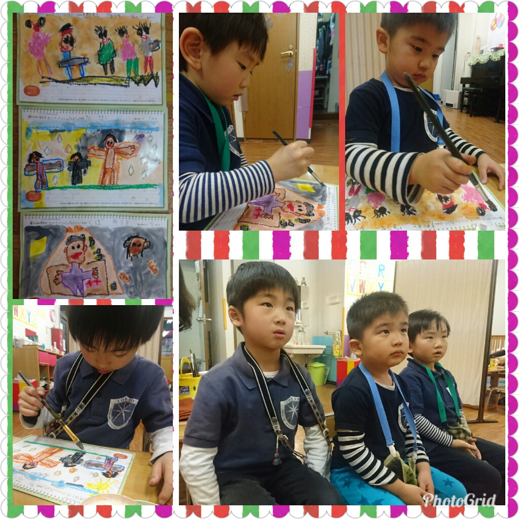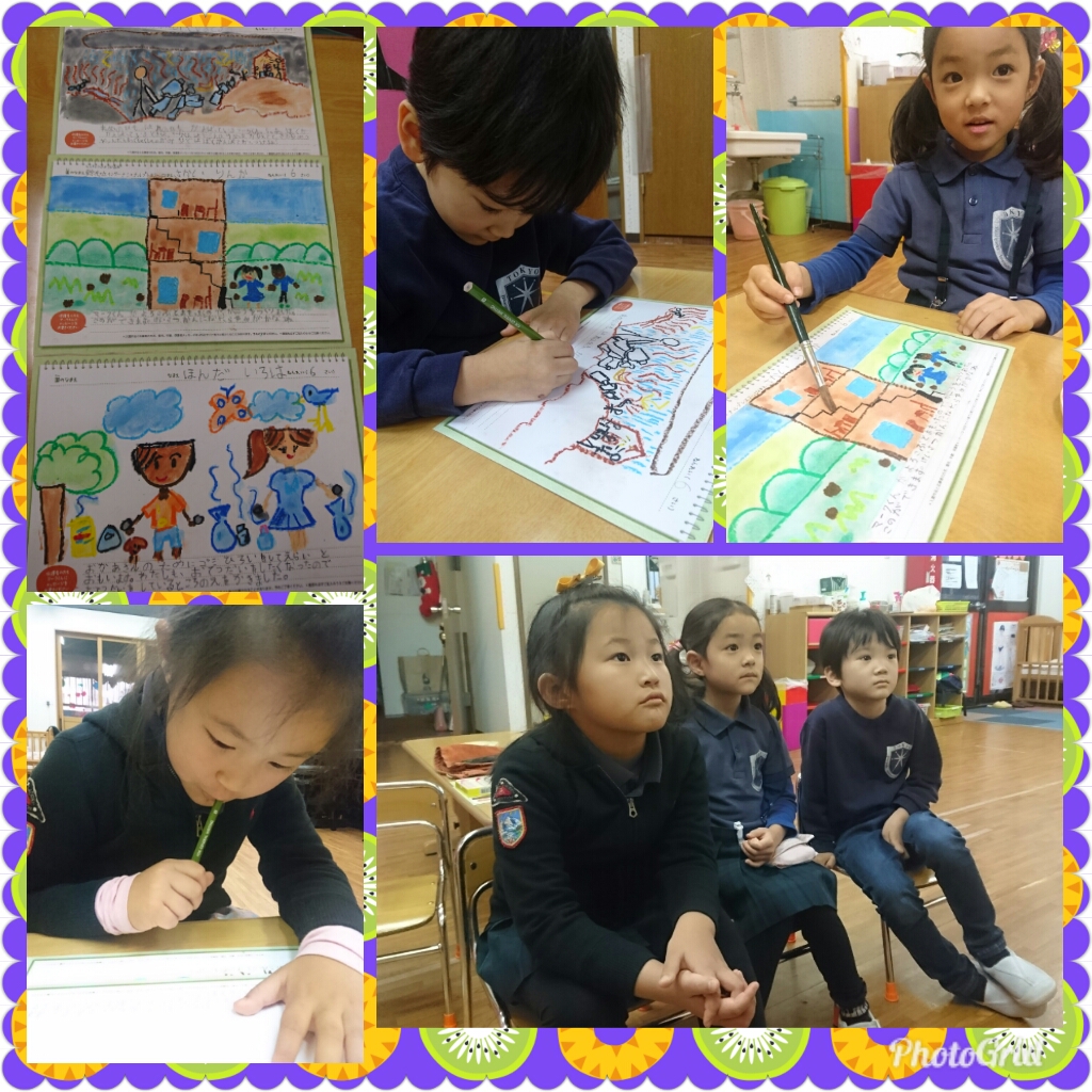 年中さんは、JICAのお絵描きコンテストの絵を描きました。ストーリー性のある素敵な絵を描いてくれました。DVDを観ているときの真剣な顔がとっても素敵でした。