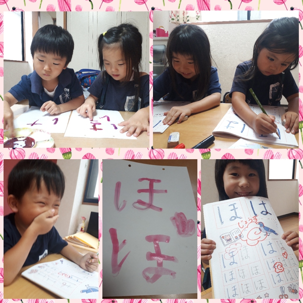 『ほの上が出ると、Ms.Mihoの頭から角が出る(鬼になる)から注意してねー』と警告すると、みんな嬉しそうに、そしてドキドキわくわくしながらとーっても上手に書いてくれました。『みほ先生のほだから♡も書いたよ』と嬉しそうに見せてくれた子もいました。