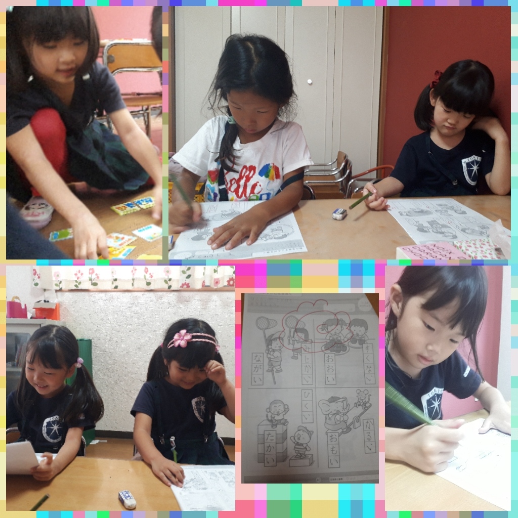 年長さんは短い文章作りと、反対言葉の勉強。そして、さいごは反対言葉のカルタ遊びをしました。
