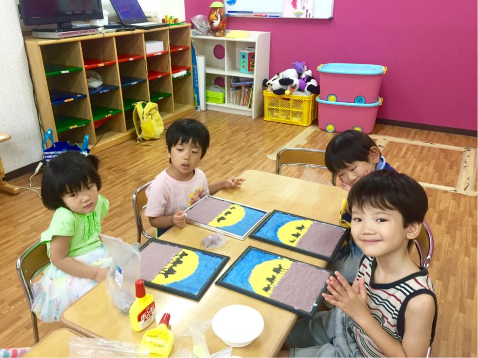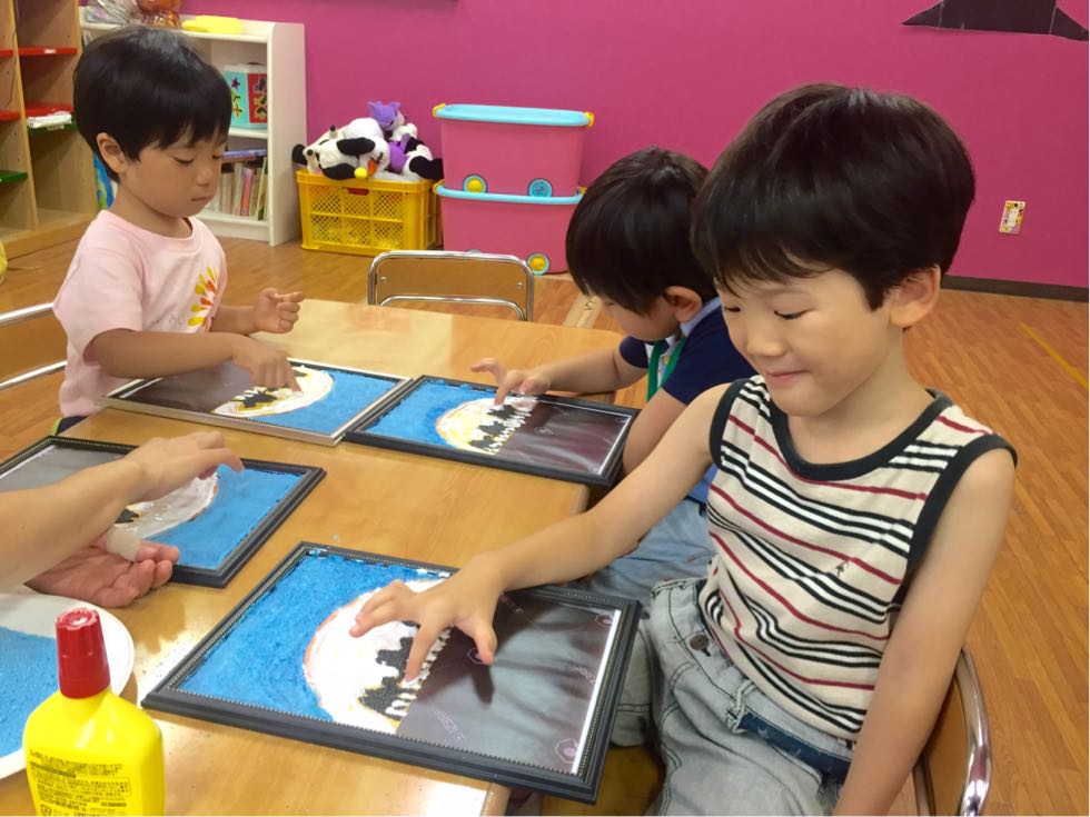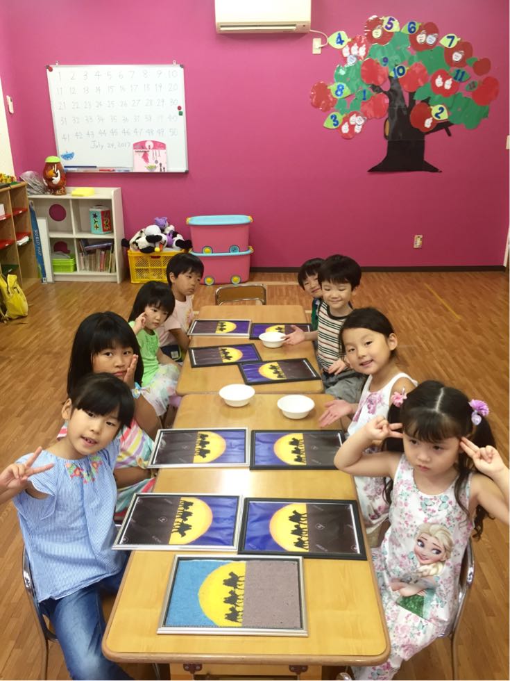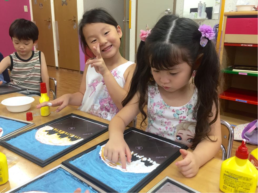 In the afternoon, we did sand-art. We sprinkled colorful sands on the pictures and made beautiful crafts on Arabian desert.