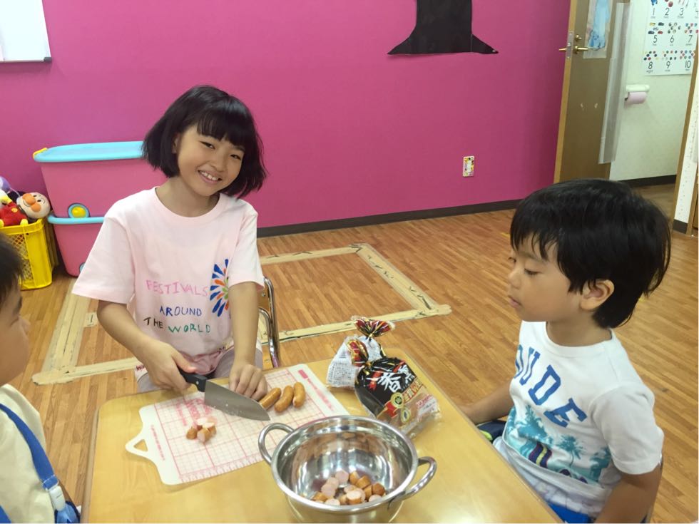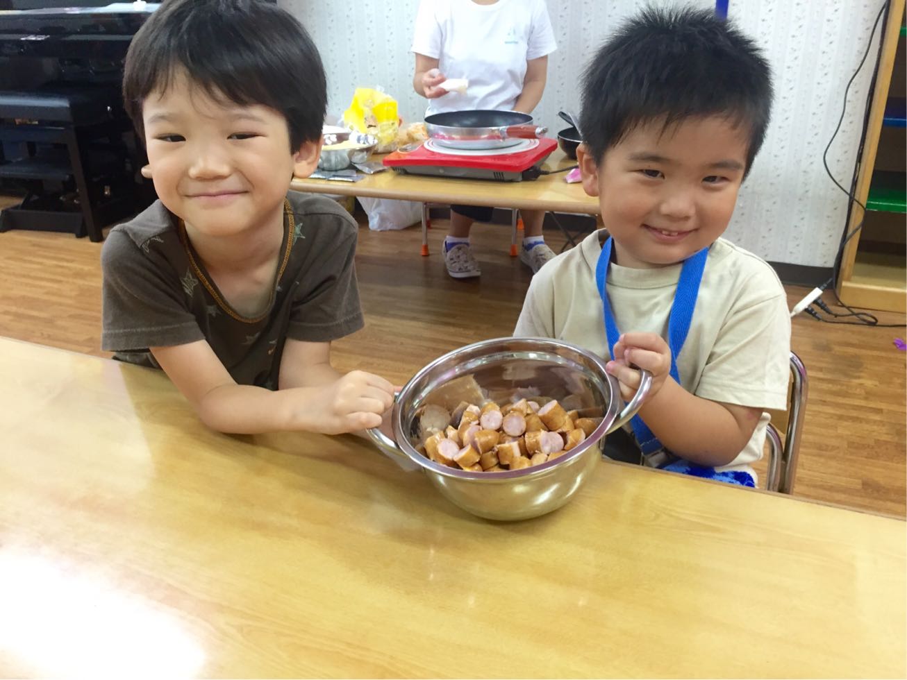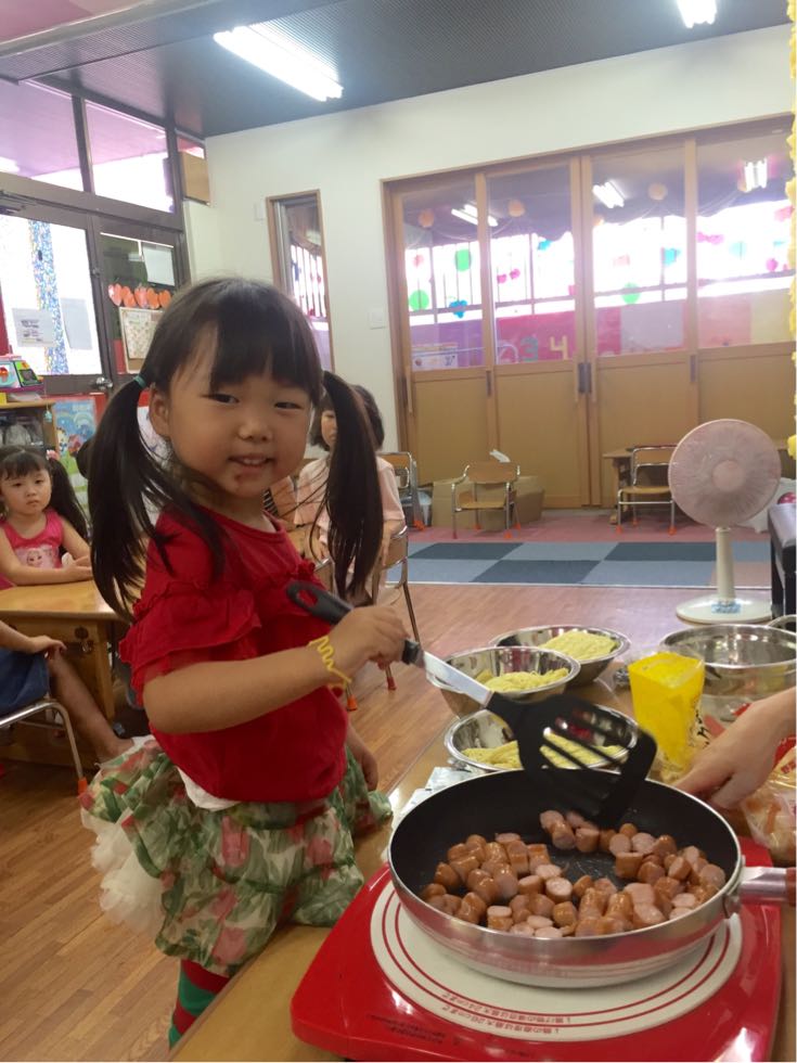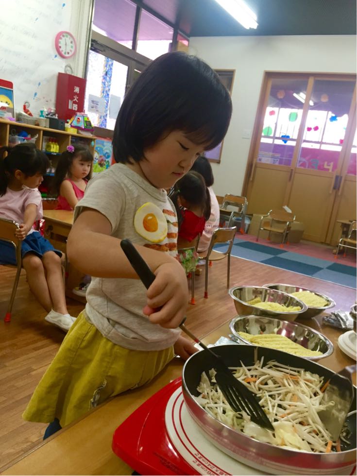 We cooked fried noodles with lots of vegetables and sausages. It was very delicious. Kids were excited and actively