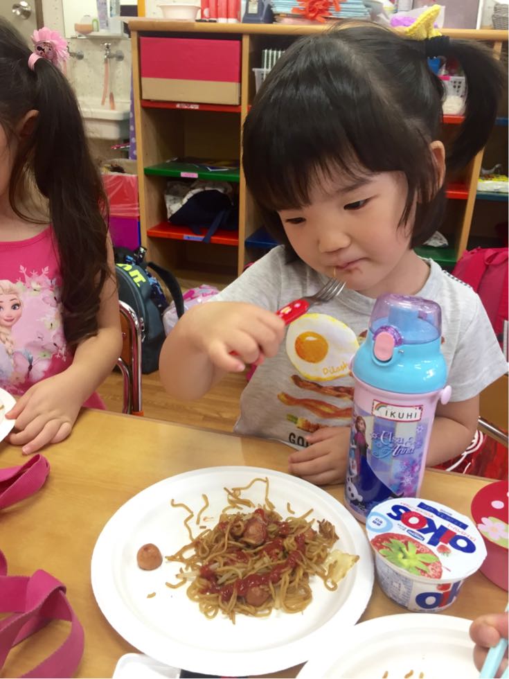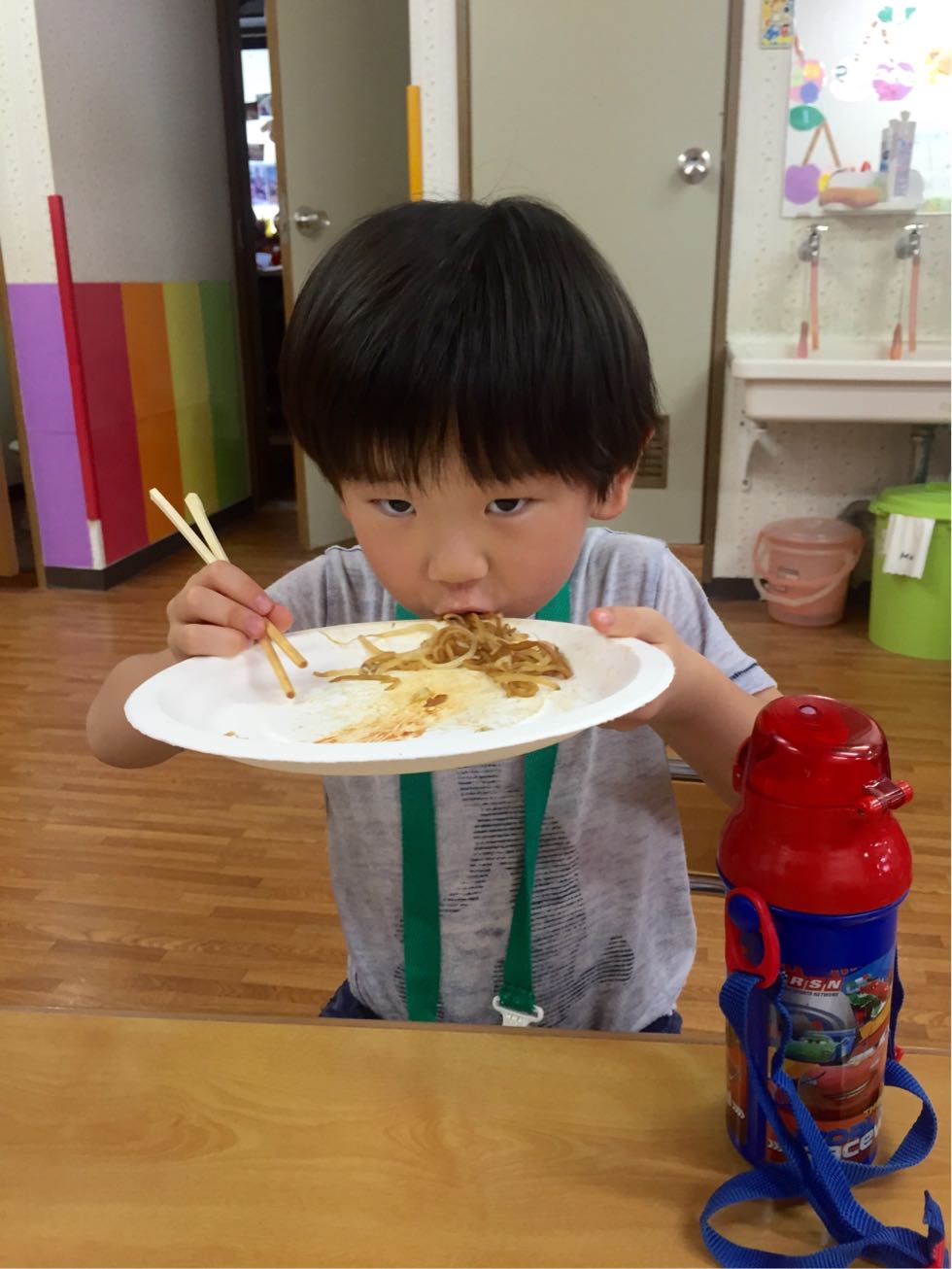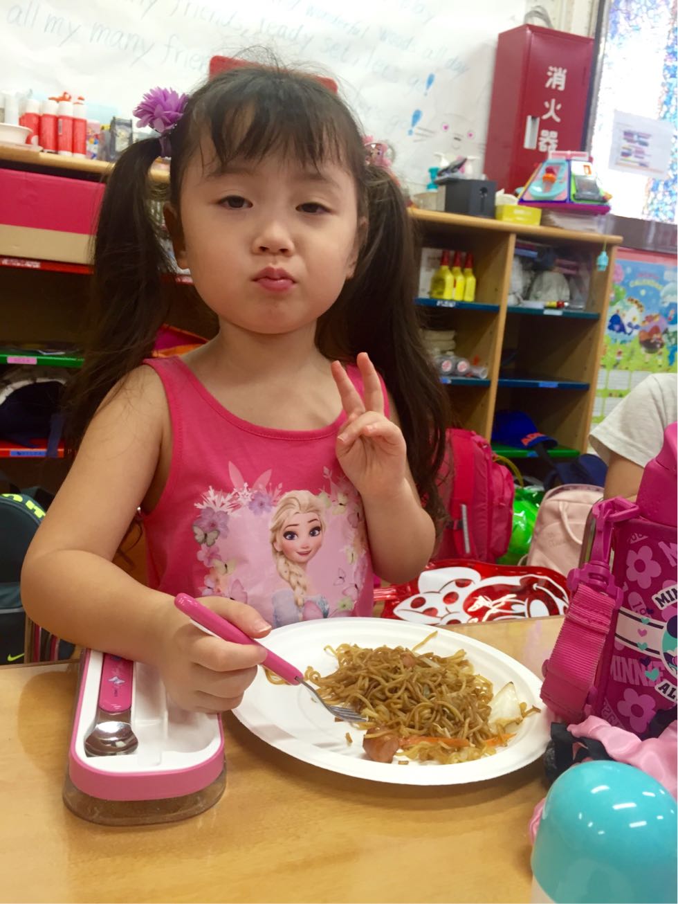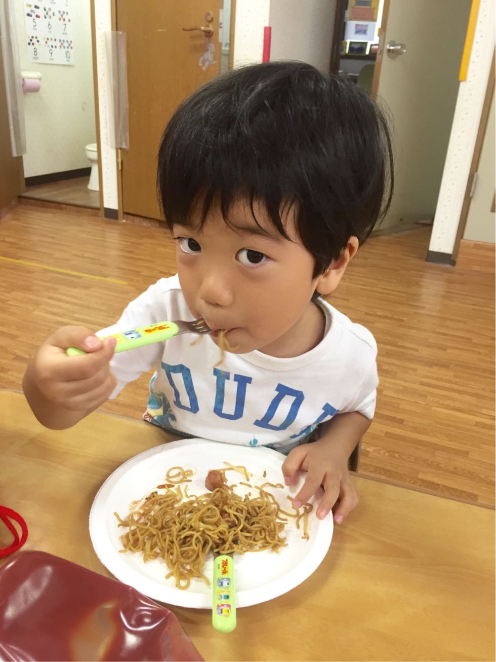 We cooked fried noodles with lots of vegetables and sausages. It was very delicious. Kids were excited and actively