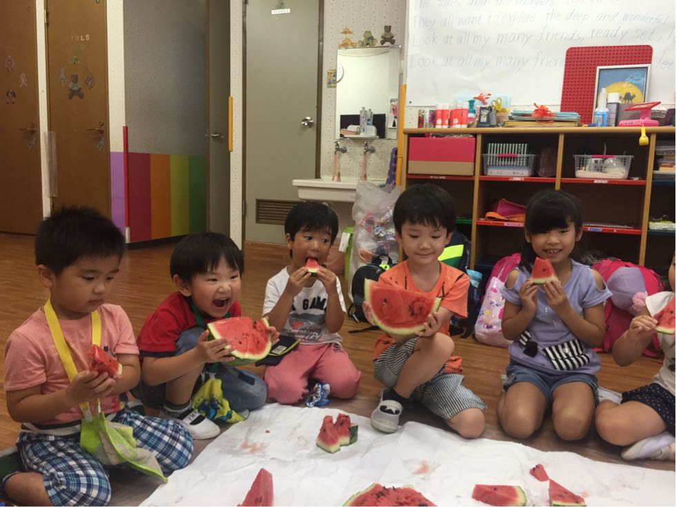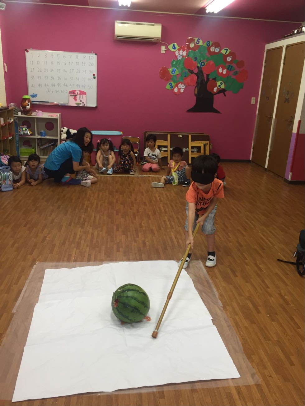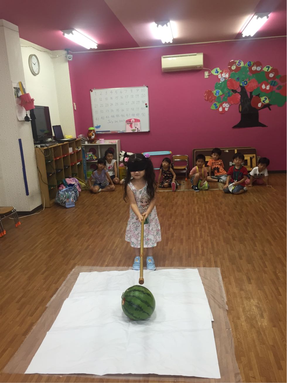 In the afternoon, we had watermelon hitting. It was really fun to hit the watermelon using the blind-fold and the best part was to eat the big watermelon together.