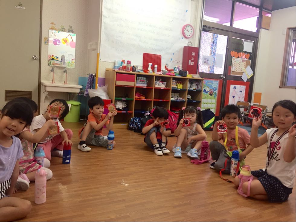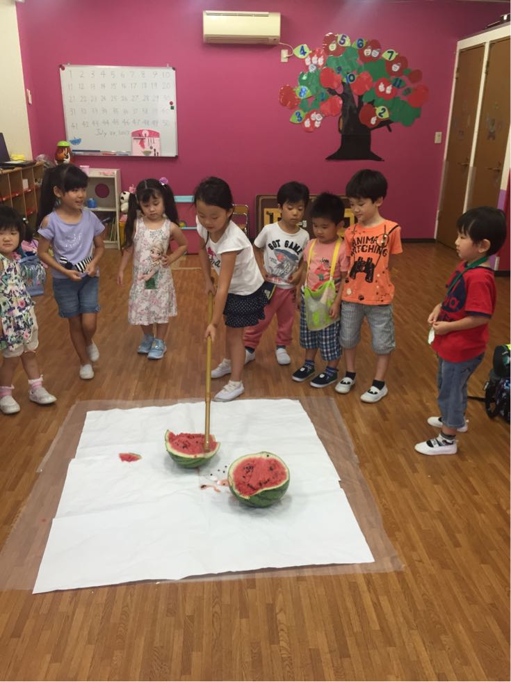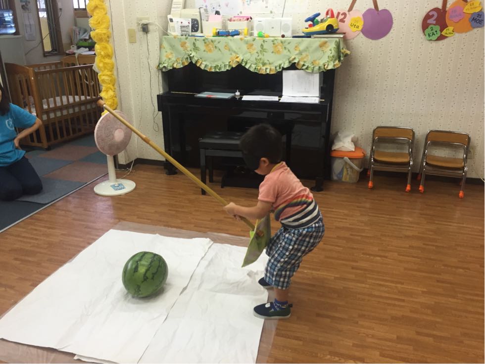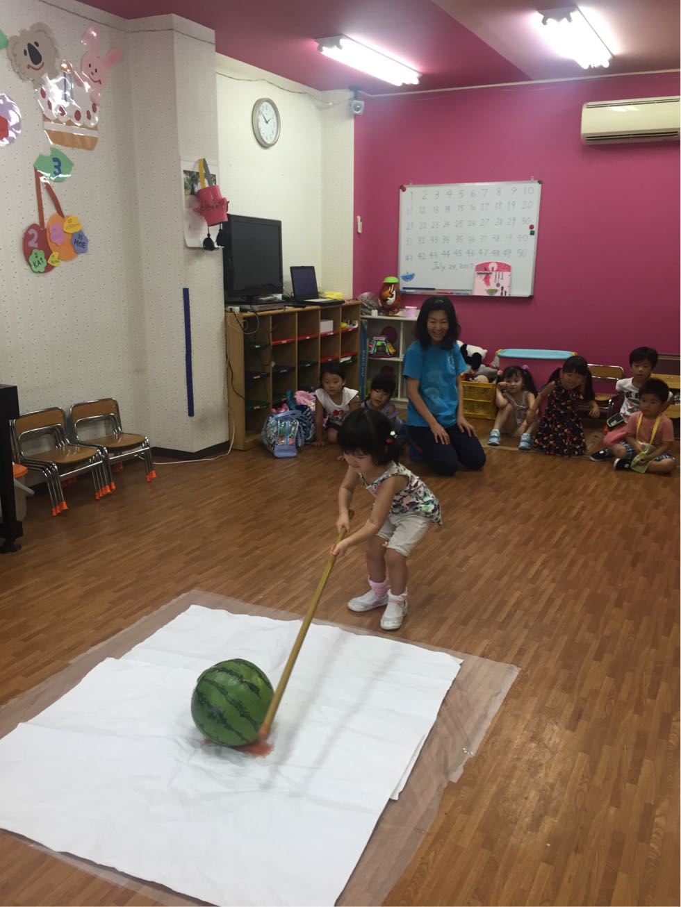 In the afternoon, we had watermelon hitting. It was really fun to hit the watermelon using the blind-fold and the best part was to eat the big watermelon together.