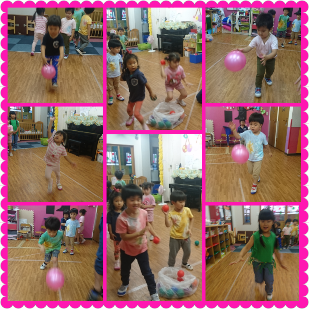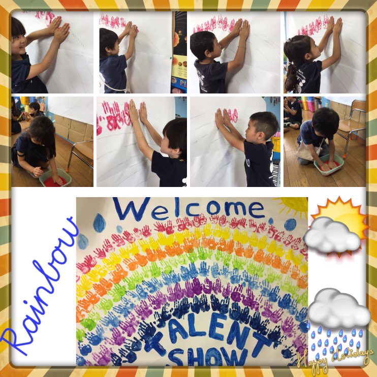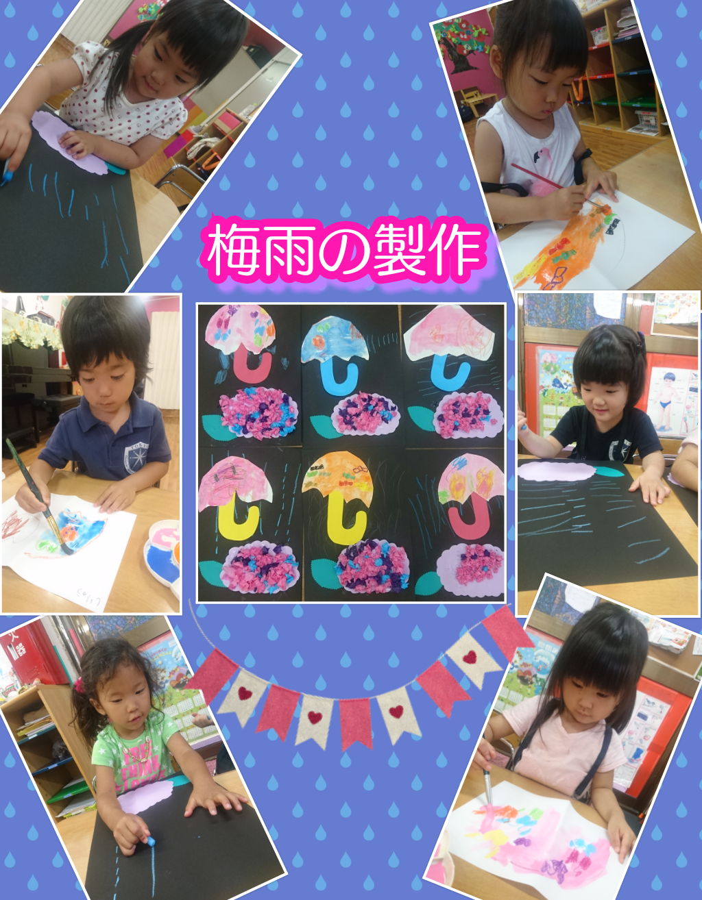 クレヨンと絵の具で可愛い傘を、お花紙を小さく丸めて紫陽花を作りました。日本語を喋りながら楽しく製作しました。