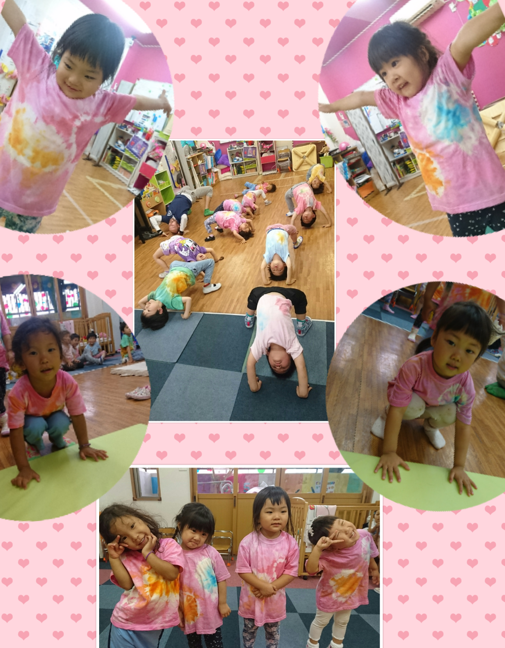 UKIUKidsのある水曜日は「UKIUKids power」で、lunchを食べ終えるのが早くなるんだそう♪Tシャツを着てマット運動をしました。