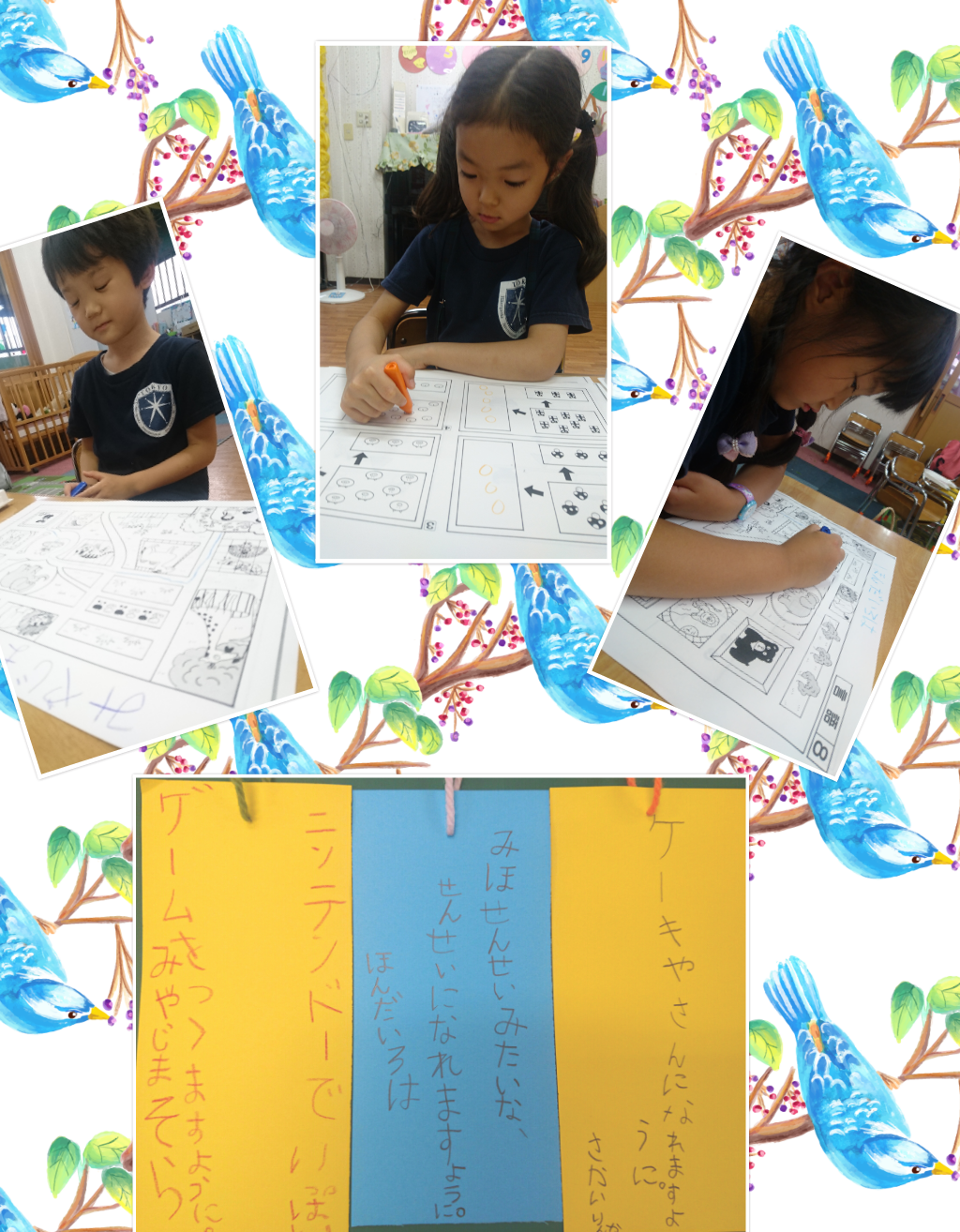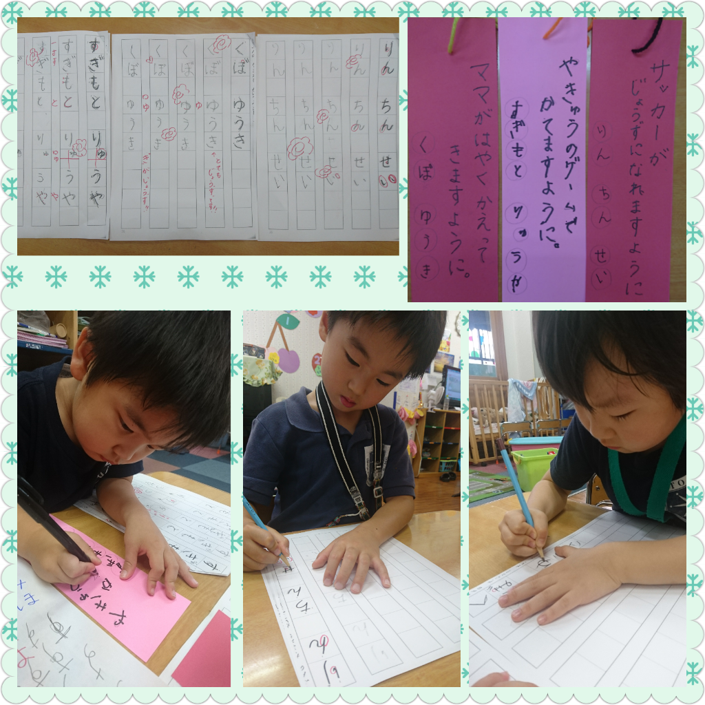名字と名前の説明をしたり、七夕の話をして短冊に願い事を書きました。短冊に上手に名前を書けて誇らしげでした。